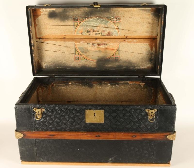 Wood trunk which has a black metal wrap with oak accents. Gold hardware. Measures 28"x 16"
