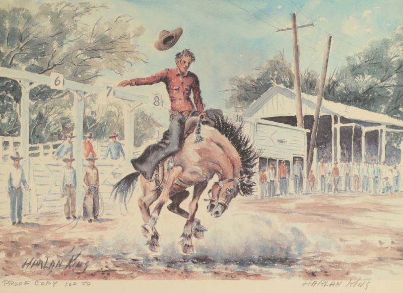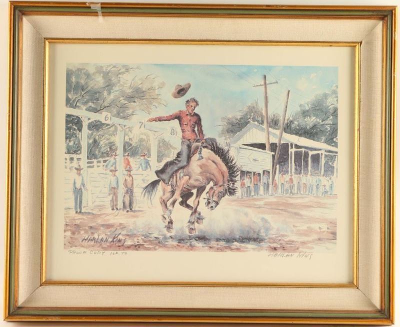 by Harlan Keene 1/50 Artist Proof depicting cowboy on a bucking bronco. Image measures 17 1/2"x13 1/2" in green and gold frame.