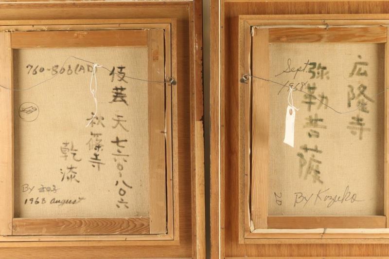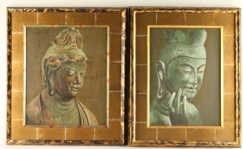 Painted by Kazuko Klever signed lower right depicting stone Buddas. Image size 18"x15" in gold and black frames.