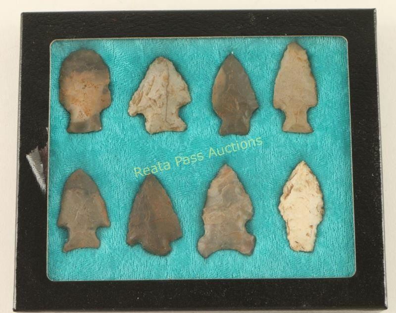 W. Texas and E. New Mexico in origin according to consignor, unknown age. 8 points total in Riker case with teal fabric background. Offered "as is", we don't guarantee the authenticity of this item, please do your research. All sales are final.