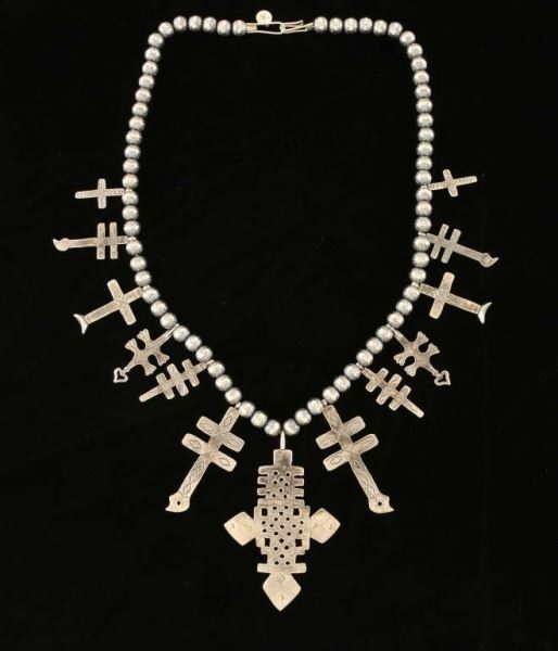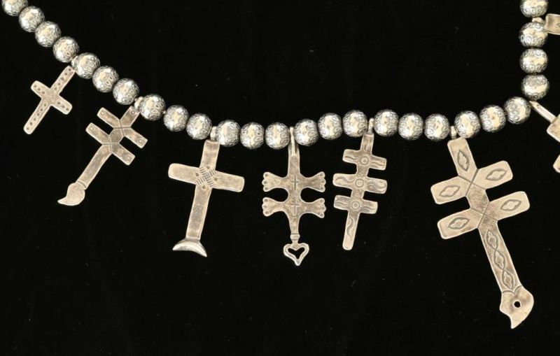 This Native American Silver Cross Squash Blossom Necklace displays an early style of ceremonial jewelry, that was influenced by the Spaniards! You would say, that this is a simple design but the combination of the individual stations with the impressive centerpiece, make this extraordinary! At the center, the cross is 3-5/8" x 2-1/2" & each subsequent one gets smaller. it's finished with 10mm, patterned bench bead strands. Including the hook/eye clasp, it's 26-1/2" long & was made in our shop by Lenora Begay. For a man or woman, this Native American Silver Cross Squash Blossom Necklace is heirloom quality jewelry that you will love to wear!