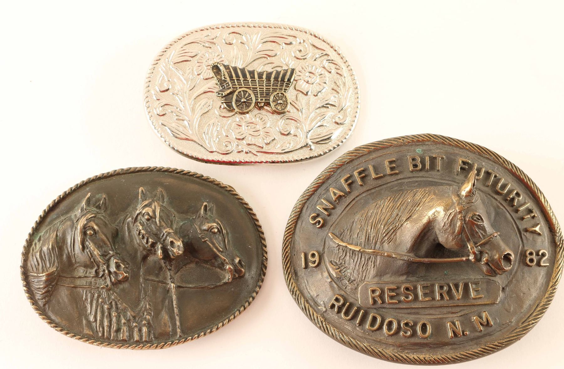 1) Oval brass buckle with three molded horses heads with rope trim. Marked "Buckles By Limes". (1) Oval buckle with molded horse head that reads "Snaffle Bit Futurity 1982 Reserve, Ruidoso NM". (1) Silver metal buckle with floral tooled design and brass covered wagon in the center.