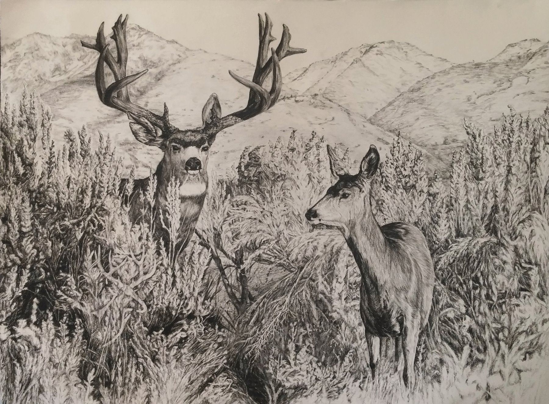 Bringing awareness to protecting wildlife and their habitat is an important and worthwhile project. I hope you enjoy this piece, which is the first of a series I will be drawing for the Mule Deer Foundation.