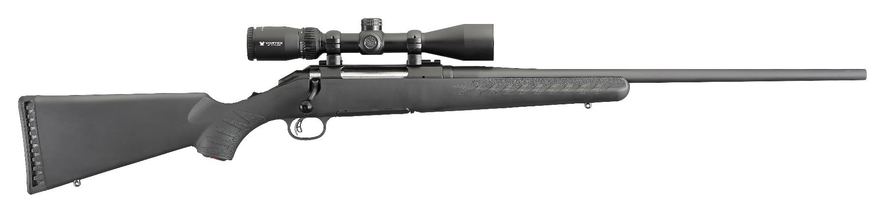 Ruger's American .308 Bolt-Action Rifle with Vortex Crossfire II 3-9x40 Scope is a 100% American-made rifle sporting the latest engineering innovations from Ruger. Its Marksman Adjustable™ Trigger is adjustable from 3 to 5 lbs, breaks clean and provides customization for the individual shooter. Ergonomic and lightweight black composite stock for a comfortable fit and delivers quick, easy handling. Grip serrations offer a positive hold in a variety of conditions. Softrubber recoil pad dramatically reduces felt recoil. Three-lug bolt has a short 70° throw that easily clears your scope. Dualcocking cams for smoother and easier cycling from the shoulder. Power Bedding™ integral block system solidly locks the receiver and free-floats the barrel for unrivaled accuracy. Hammer-forged barrel is ultraprecise and delivers exceptional accuracy, longevity and easy cleaning. Four-round, rotary-bolt magazine fits flush and complements the smooth feed cycle. Receiver is drilled and tapped to accept optics mounts. Tang safety is user friendly. Scope bases are included. Crossfire II 3-9x40 riflescope features fully multicoated lenses to increase light transmission for less haze and extra-vibrant colors. Fast focus eyepiece for quick and easy reticle focusing. Reset turrets can be re-indexed to zero after sighting in the scope. Waterproof one-piece, Nitrogen-filled tube inhibits internal fogging. Durable hard-coat-anodized finish reduces glare.