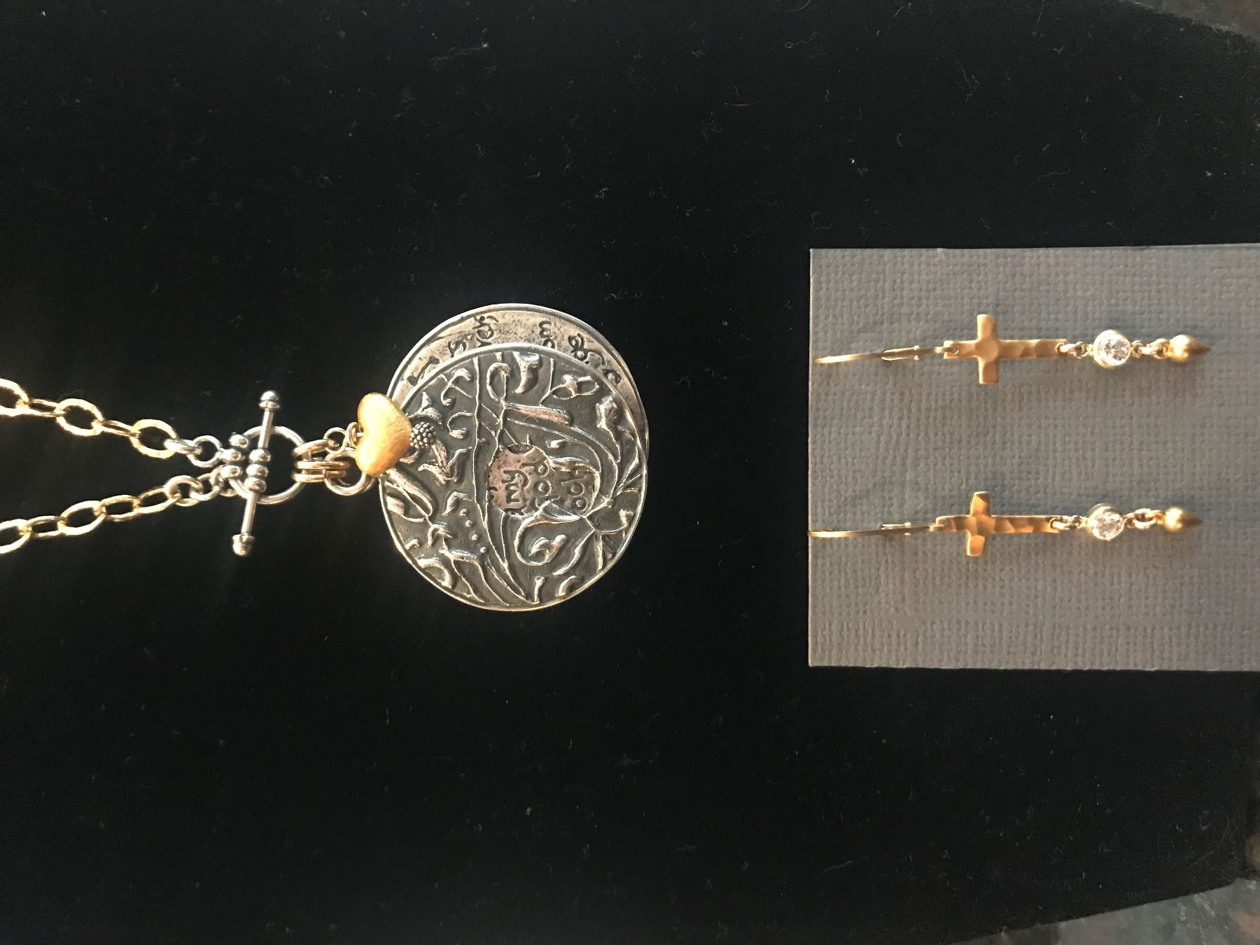 The pendant is hung on a high quality gold-filled chain with Devoted Dove signature toggle closure and an added heart charm. Accompanying the necklace is a pair of charming gold colored cross earrings with a dangling cubic zirconia on a gold-filled ear wire. Beautiful!