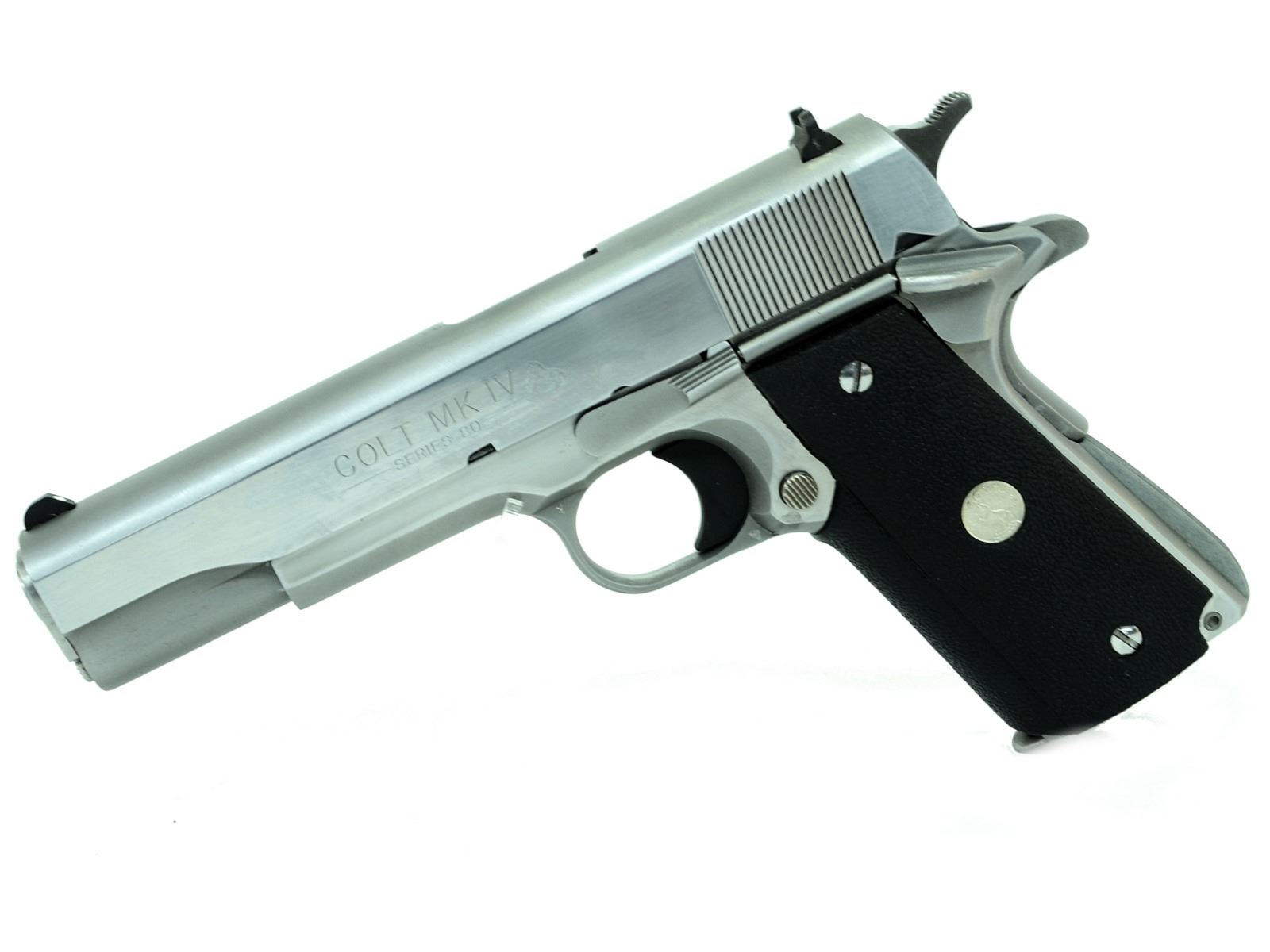 2209HR-0411 GOVERNMENT MODEL MARK IV, SERIES 80, .38 SUPER AUTO CAL, 7 SHOT SEMI-AUTO. 127MM BARREL. STAINLESS FINISH, COLT INSIGNIA GRIPS, COMES WITH ORIGINAL BOX & PLASTIC CASE.