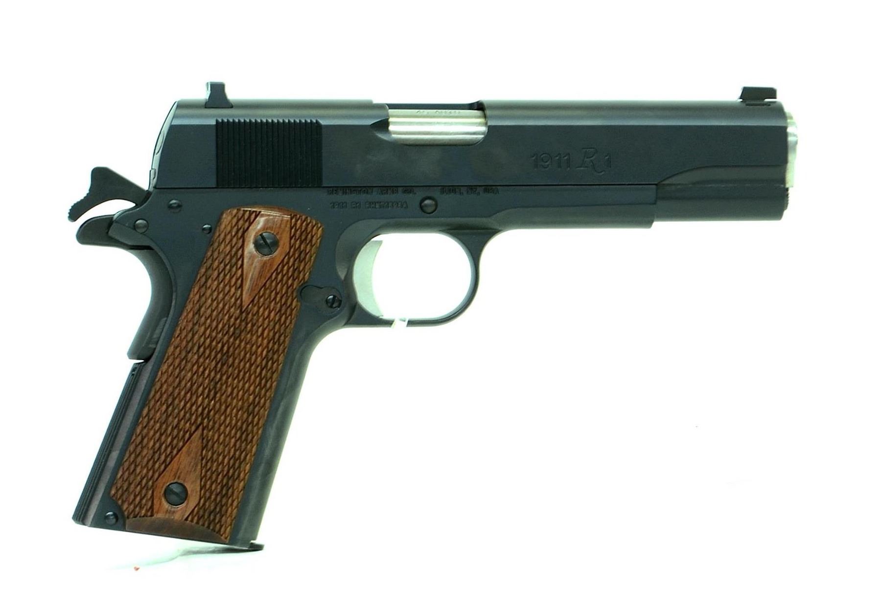 2293HR-0528 REMINGTON 1911 R1 45 ACP SEMI-AUTO. 127MM/5" BARREL. BLACK MATTE FINISH, WALNUT DOUBLE DIAMOND GRIPS. LOWERED/FLARED EJECTION PORT. 3 DOT FIXED SIGHTS. NEW IN CASE, INCLUDES 2 MAGS. MADE IN USA.