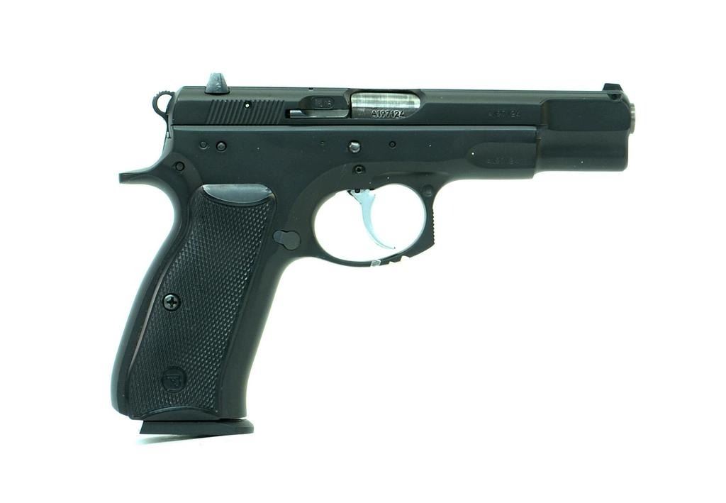 2260HR-0411 CZ MODEL C2 BD, 9MM LUGER CAL, 10 SHOT SEMI-AUTOMATIC PISTOL. 120MM BARREL, FLAT BLACK FINISH, GREEN DOT SIGHTS, BLACK CHECKERED GRIPS. ORIGINAL PLASTIC CASE, 1 EXTRA MAG. MADE IN CZECHOSLOVAKIA.