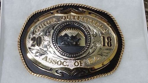 3.5” x 4.5” inch Nickel Buckle with raised bronze letter and custom inner logo with the balance of the buckle is hand floral engraved.