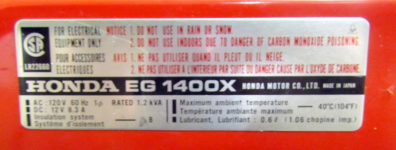 PICK UP ONLY WILL NOT SHIP HONDA EG 1400X GENERATOR, MAX TOTAL LOAD 11 AMPS, AC 120V, CHARGES 12 VOLT BATTERIES ONLY NO MANUAL, BUT MANUAL CAN BE DOWNLOADED FROM THE INTERNET, HAS A HOMEMADE COVER, AGAIN WILL NOT SHIP, PICK UP ONLY