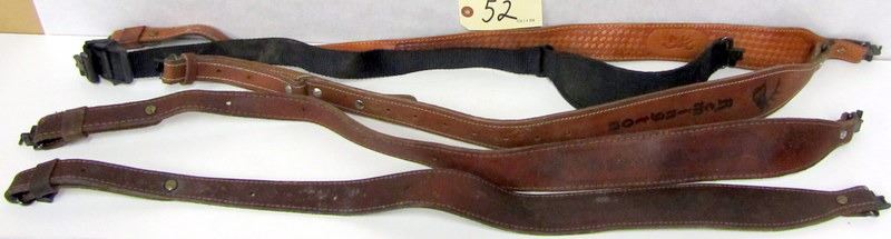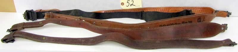 FOUR LEATHER SLINGS, SOME HAVE MARKS, ONE NYLON SLING