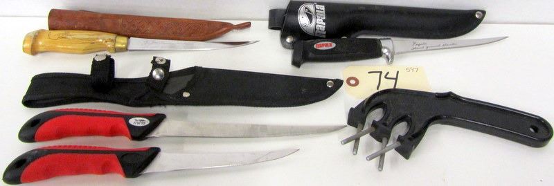 TWO RAPALA FILLETING KNIVES BOTH 6" BLADES, SET OF TWO NWTF FILLETING KNIVES ONE 6" & ONE8" BLADE, AN EDGEMAKER PRO SHARPENER