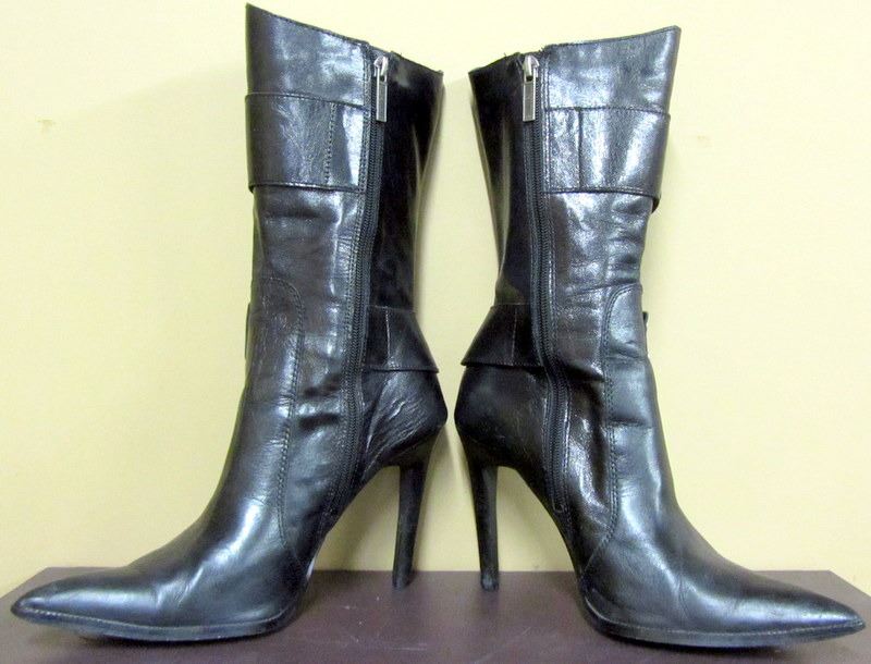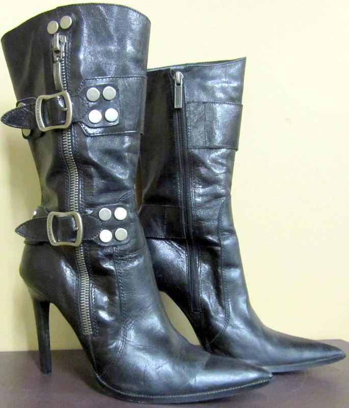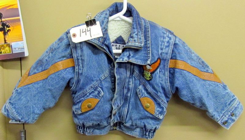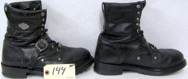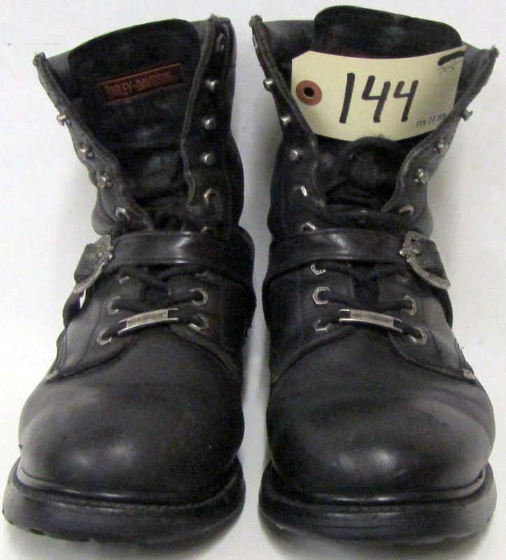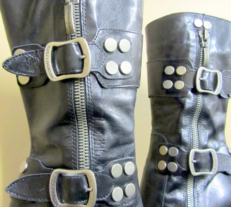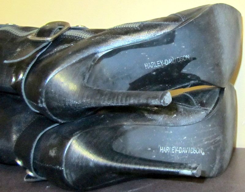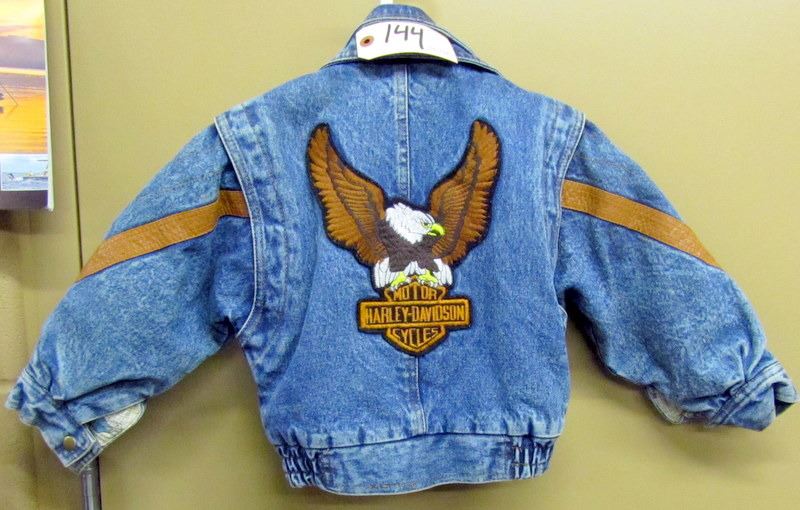 TODDLERS BLUE DENIM JACKET SIZE 2 WITH HARLEY CREST ON BACK, BLACK LONG SLEEVED TSHIRT MEN/WOMANS SIZE M WITH GRAPHICS ON FRONT ONLY, PAIR OF WOMANS BLACK HIGH HEEL HARLEY BOOTS, SIZE 8 U.S.A., USED MENS HARLEY BOOTS THOUGHT TO BE AROUND SIZE 9 1/2