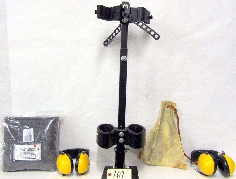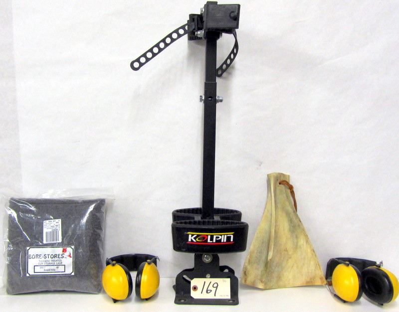 TWO SETS OF PELTOR EAR MUFFS, SILICONE TREATED GUN STORAGE SOCK 46", PIECE OF MOOSE SHOULDER BLADE FOR RACKING BRUSH, KOLPIN TWO GUN BRAKET THAT MOUNTS TO ATV SIDE X SIDE