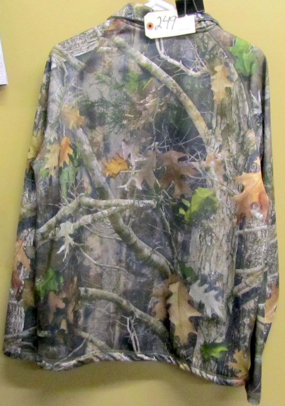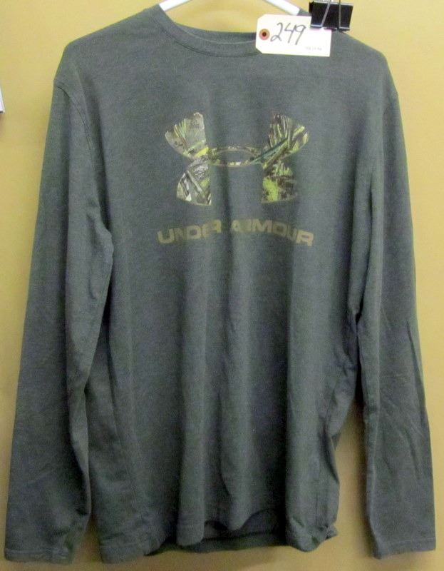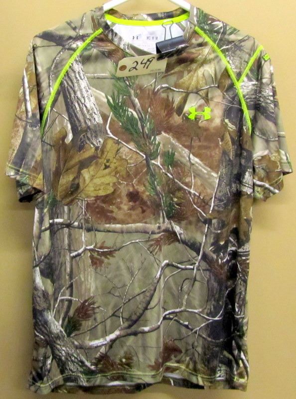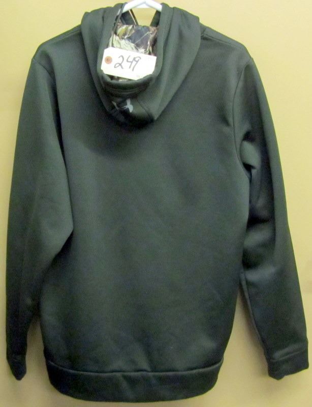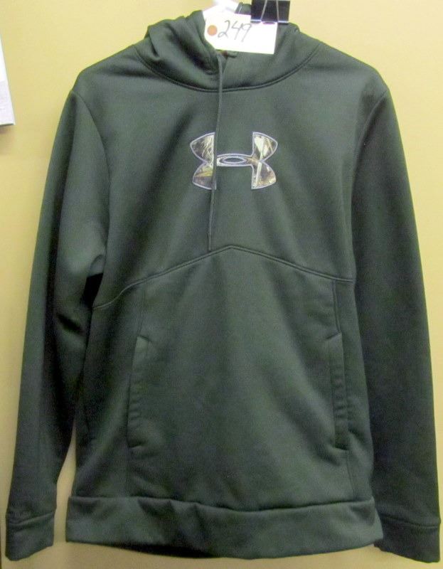 ALL SIZE MEDIUM, DARK GREEN UNDER ARMOUR HOODIE WITH FLEECE LINING, CAMO RIDGE HUNTER FLEECE LINED SWEATER, THREE UNDER ARMOUR T SHIRT, REAL TREE T SHIRT, TWO UNDER ARMOUR LONG SLEEVED T SHIRTS,
