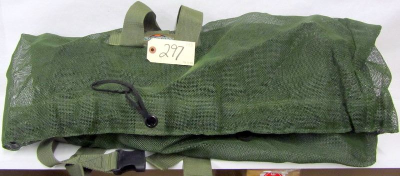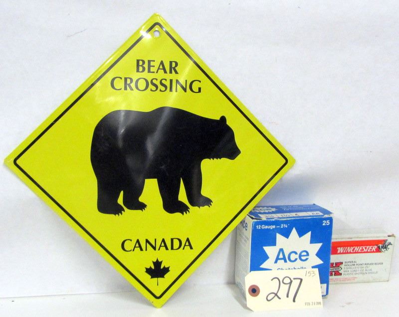 LIKE NEW FLAMBEAU DECOY BAG, LIKE NEW BERETTA SHOTGUN SHELL BELT, 25 RNDS 12 GA 2 3/4" # 4, 5 RNDS 2 3/4" RIFLED SLUGS, TIN BEAR CROSSING SIGN