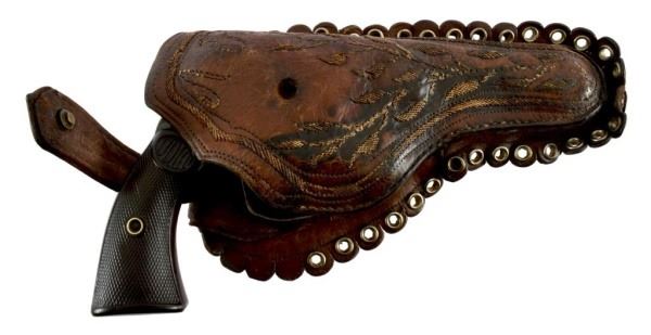* With antique Mexican revolution holster. Embellished with Maggae scallop edge with rivets. Rare From an old Columbus New Mexico collection. Made famous by the Pancho Villa raid in 1916.