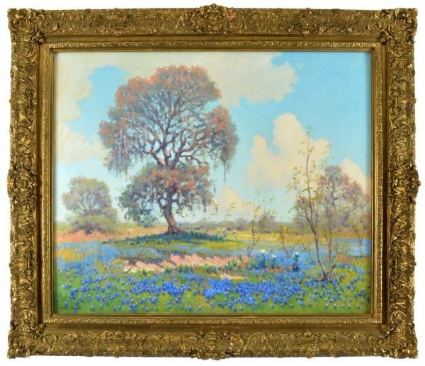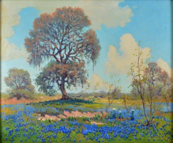 Robert Wood (1889-1979). "Bluebonnets Near San Antonio" 25" x 30". Signed lower left. Painted circa 1925. A great example of his Bluebonnet landscapes of Texas painted west of San Antonio.