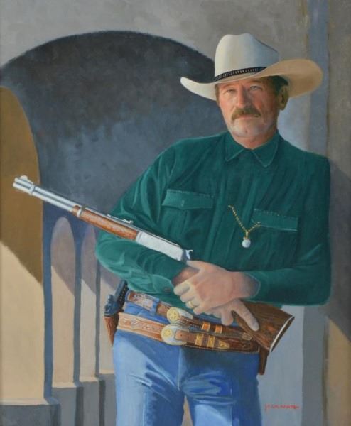 30 x 40 oil on canvas by Texas artist the late Jack White. The official portrait artist of the Texas Rangers. He painted most of the modern Texas Ranger portraits in the Ranger museum. This pose is the one made famous by Joaquin Jacksons NRA Spokeperson ads.