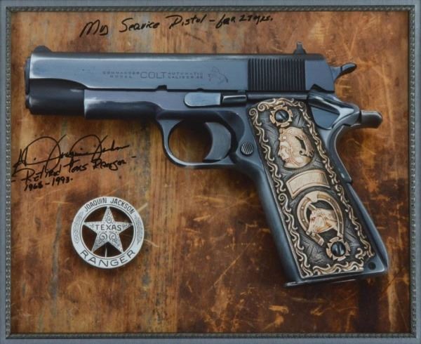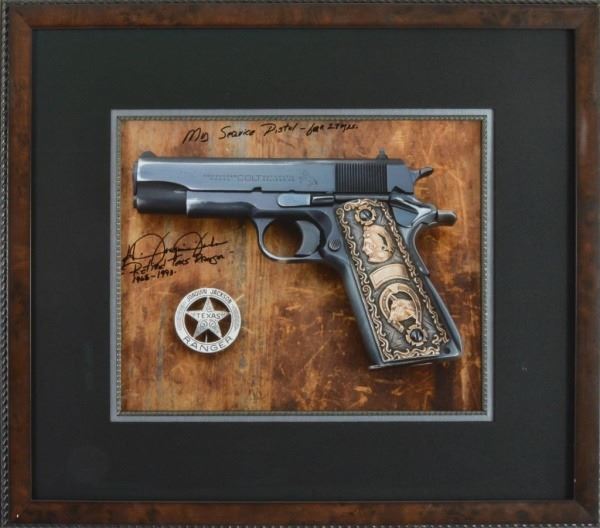 Custom framed composite photo. Includes his Colt 1911, Winchester Model 94 SRC, personal badge, and best selling auto biography "One Ranger".