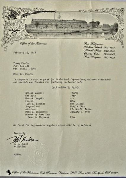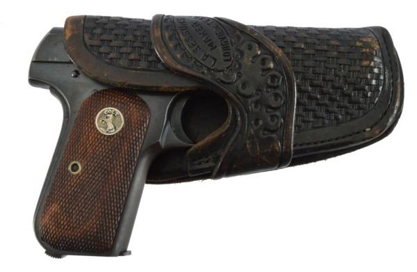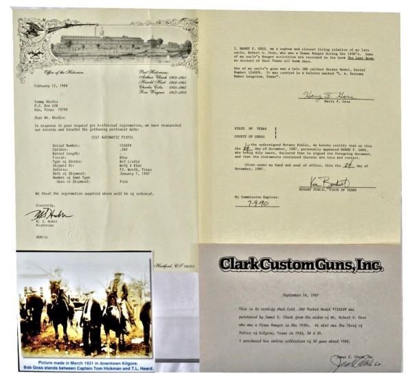 * This Colt 1908 Pocket Pistol belonged to TX Ranger Robert Goss, who was Lone Wolf Gonzaullus' partner. Factory letter shipped to Wolf & Klar in Fort Worth, TX. With original holster. With factory letter, paperwork, and photo. Made in 1937