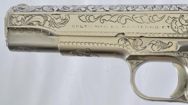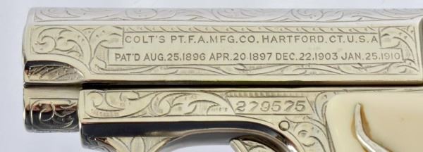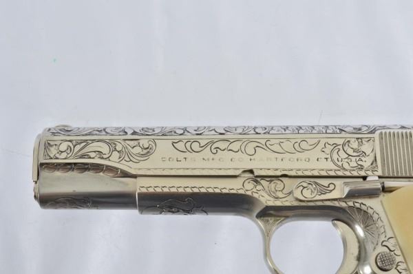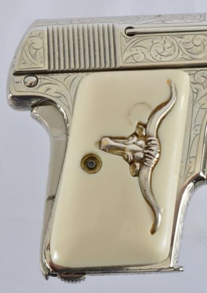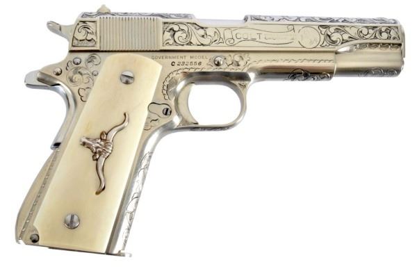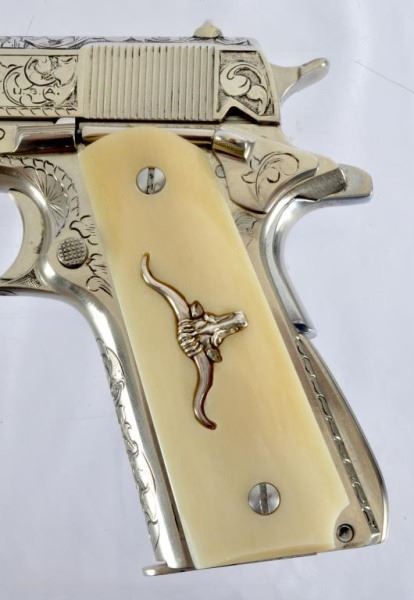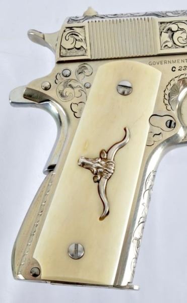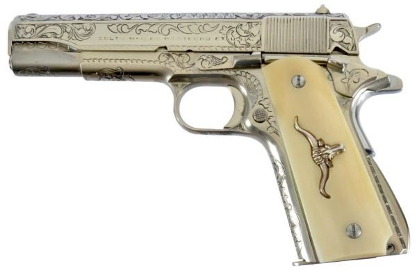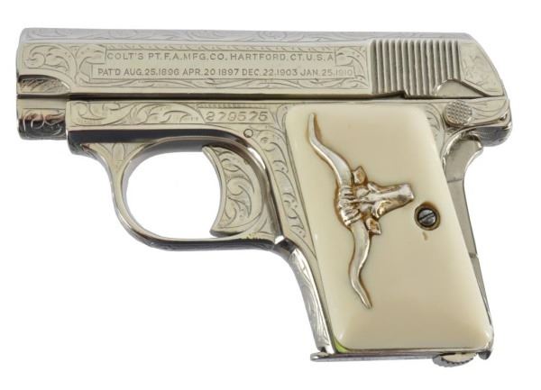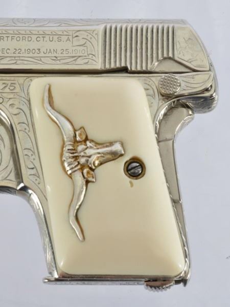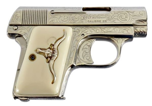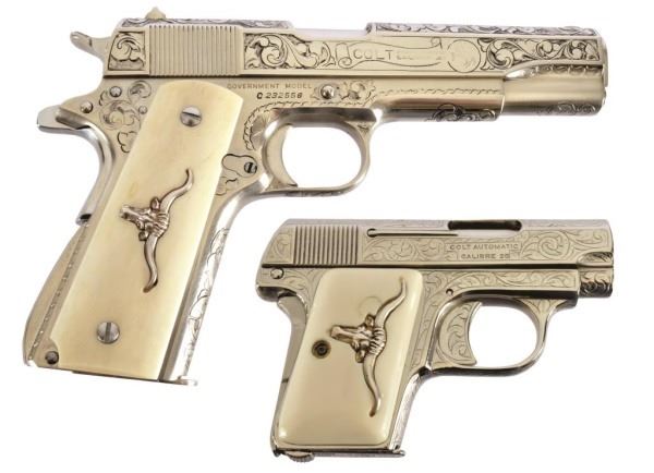 * Colt 1911 .45 and Colt Model 1908 Vest Pocket .25. The 1911 alone was appraised for $45,000. Nickel Plating sets off the ivory grips, and the Texas Longhorns make this a true Texas pair. With Colt 1911 factory letter.