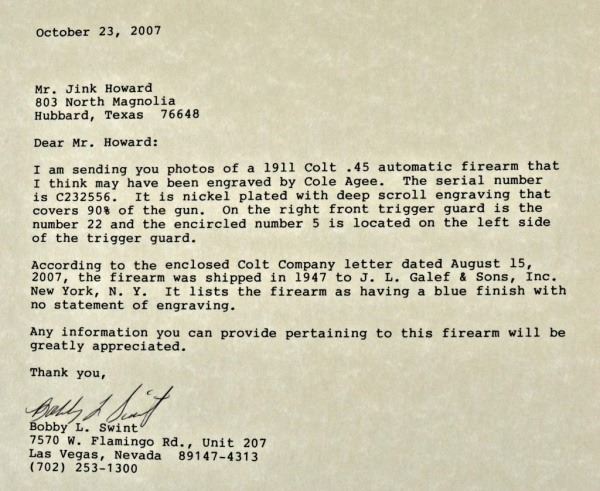 Lot 124 Cole Agee Master Engraved Matched Set Colts