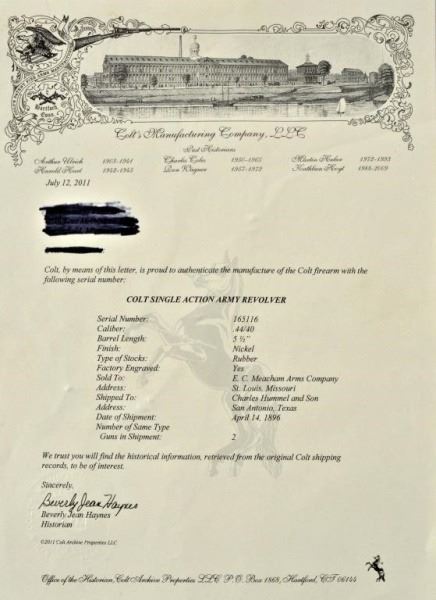 This factory engraved SAA went to Charles Hummel in San Antonio, the home of the Gunfighters. Very few colts are document to Texas pre-1900, of those handful, less than 10 were factory engraved. Factory letter.