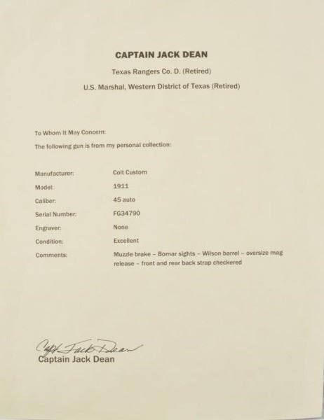 Lot 133 Texas Ranger Captain Jack Dean's Custom Colt 1911