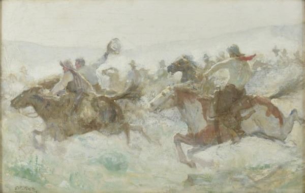 Edmund F. Ward (1892-1991) "The Race". 16"x 25". Oil on artist board. Signed and dated 1919 lower left. Ward painted with Norman Rockwell for the Saturday Evening Post. Important American Illustrator.