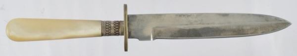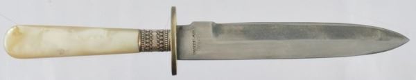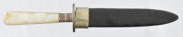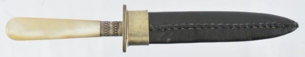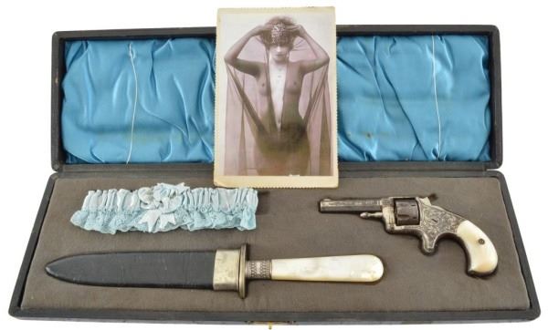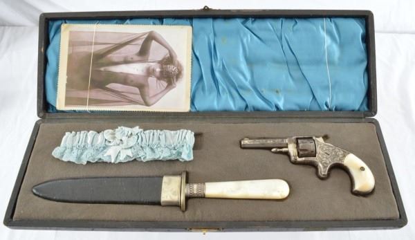 Factory engraved Allen & Hopkins .22 Revolver. Pearl handled New Orleans made dagger and sheath. Photo, garter. Case marked "Bella Rose".
