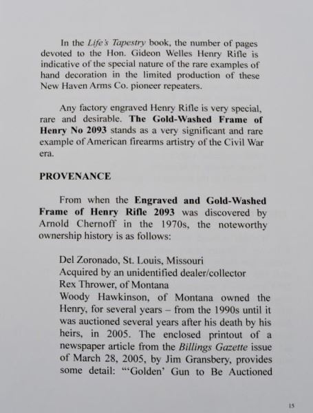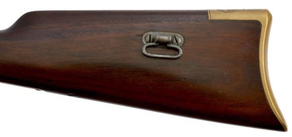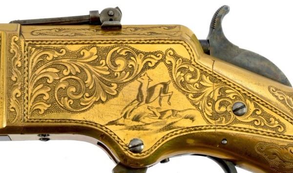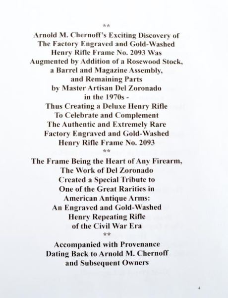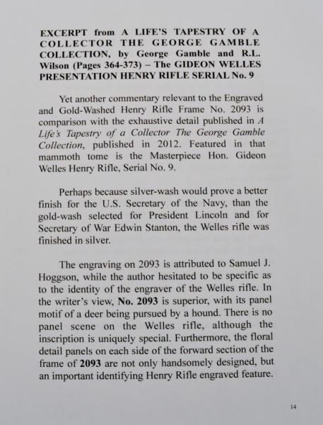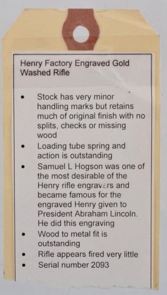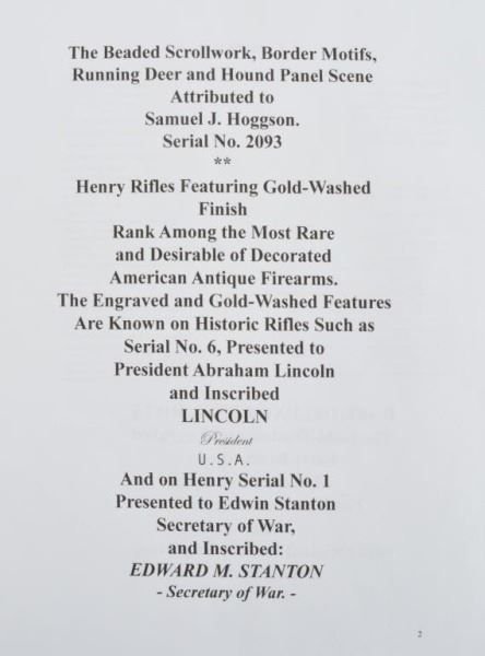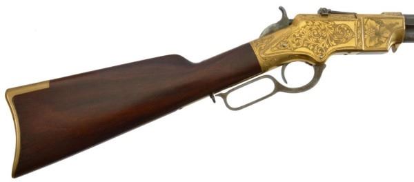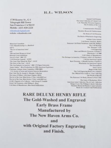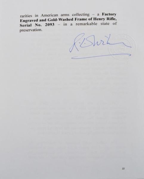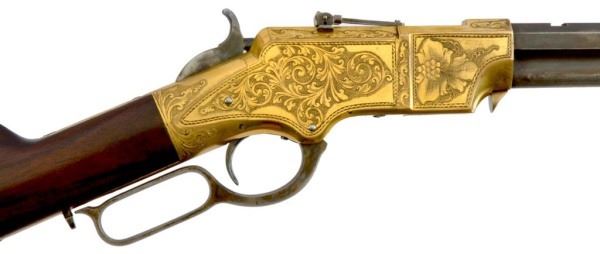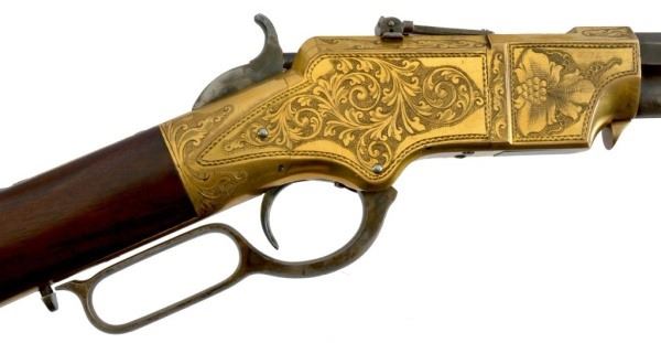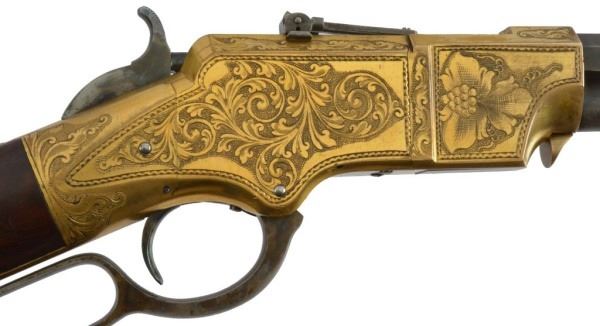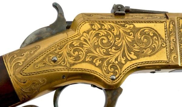 RARE gold washed and engraved early brass frame. Manufactured by The New Haven Arms Co. One of only 9 factory engraved gold wash Henry Rifles. With a 20 page long R.L. Wilson letter detailing the gun. Serial no. 2093