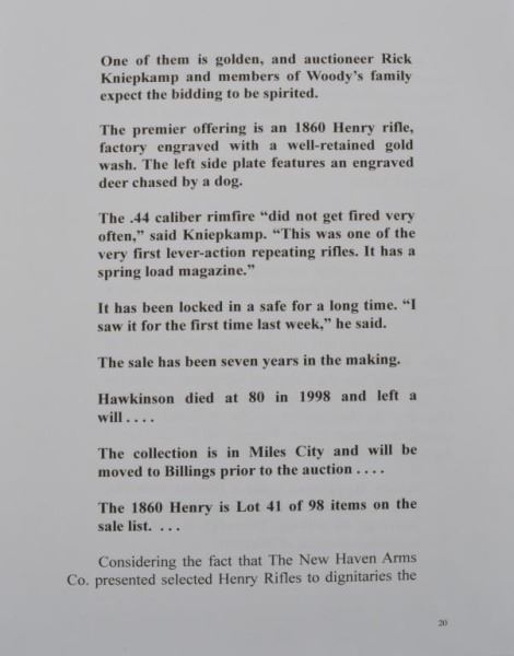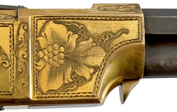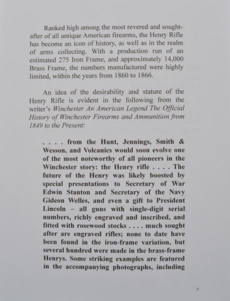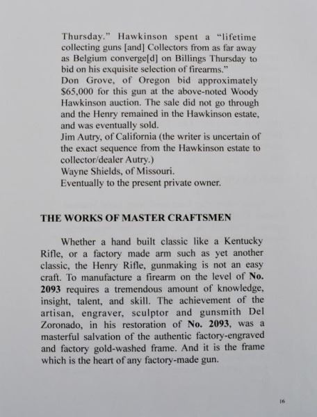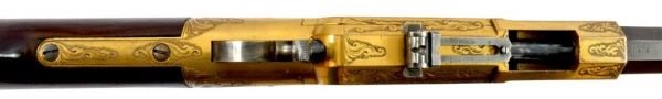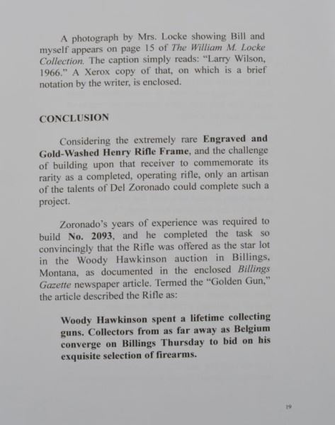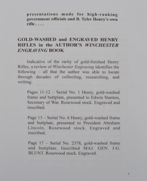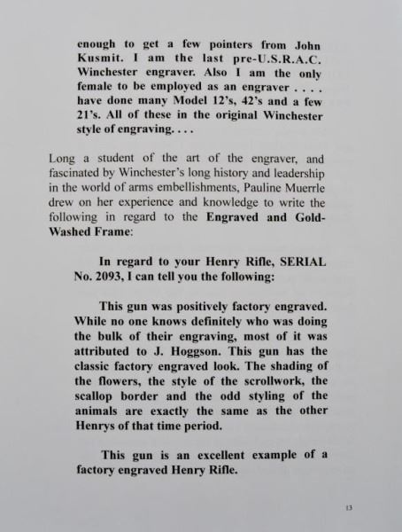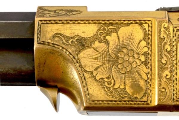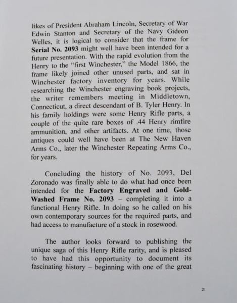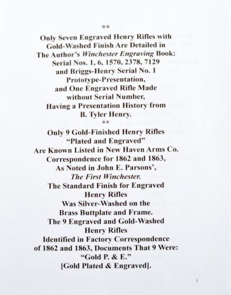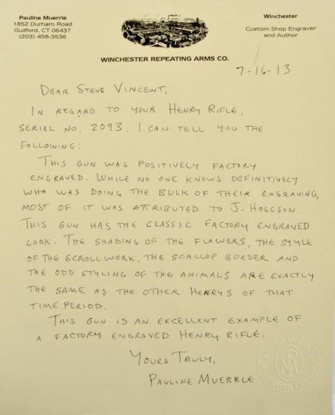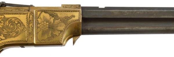 RARE gold washed and engraved early brass frame. Manufactured by The New Haven Arms Co. One of only 9 factory engraved gold wash Henry Rifles. With a 20 page long R.L. Wilson letter detailing the gun. Serial no. 2093