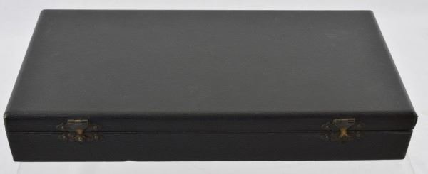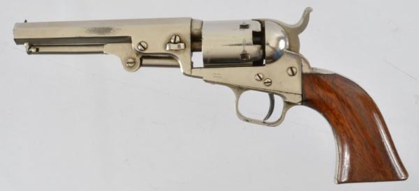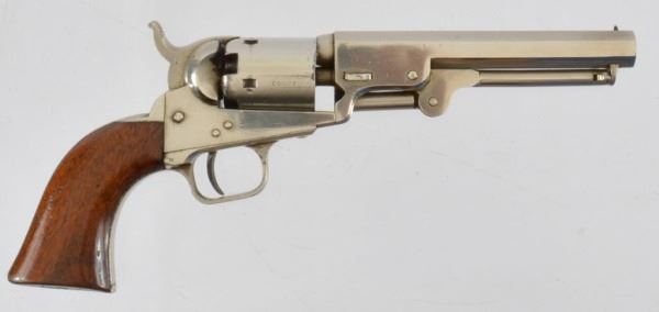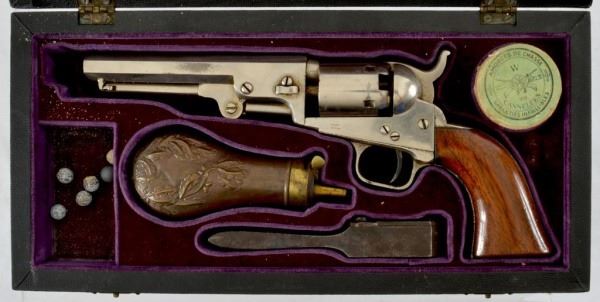 95% + Original nickel. French cased with accessories. 5" octagon barrel. Walnut grips. Gun was made in 1854 and marked "Address Sam'l Colt/New York City" on the top of the barrel and Colt's patent on the left side of the frame with matching serial numbers. It is fitted with standard post and hammer notch sights and a one piece walnut grip. The revolver comes in a French fitted case with an Amorces Des Chasse paper container with per caps in it. The case also contains original lead balls, leaf pattern powder flask, and a Colt Patent bullet mold. The action is fine and most of the markings are clear. The bound case has minor storage wear as well as the interior.