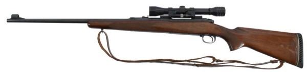 * With leather sling and flip over 4X Redfield scope (allowing the open signs to be used without removing the scope!). Manuf. 1954.