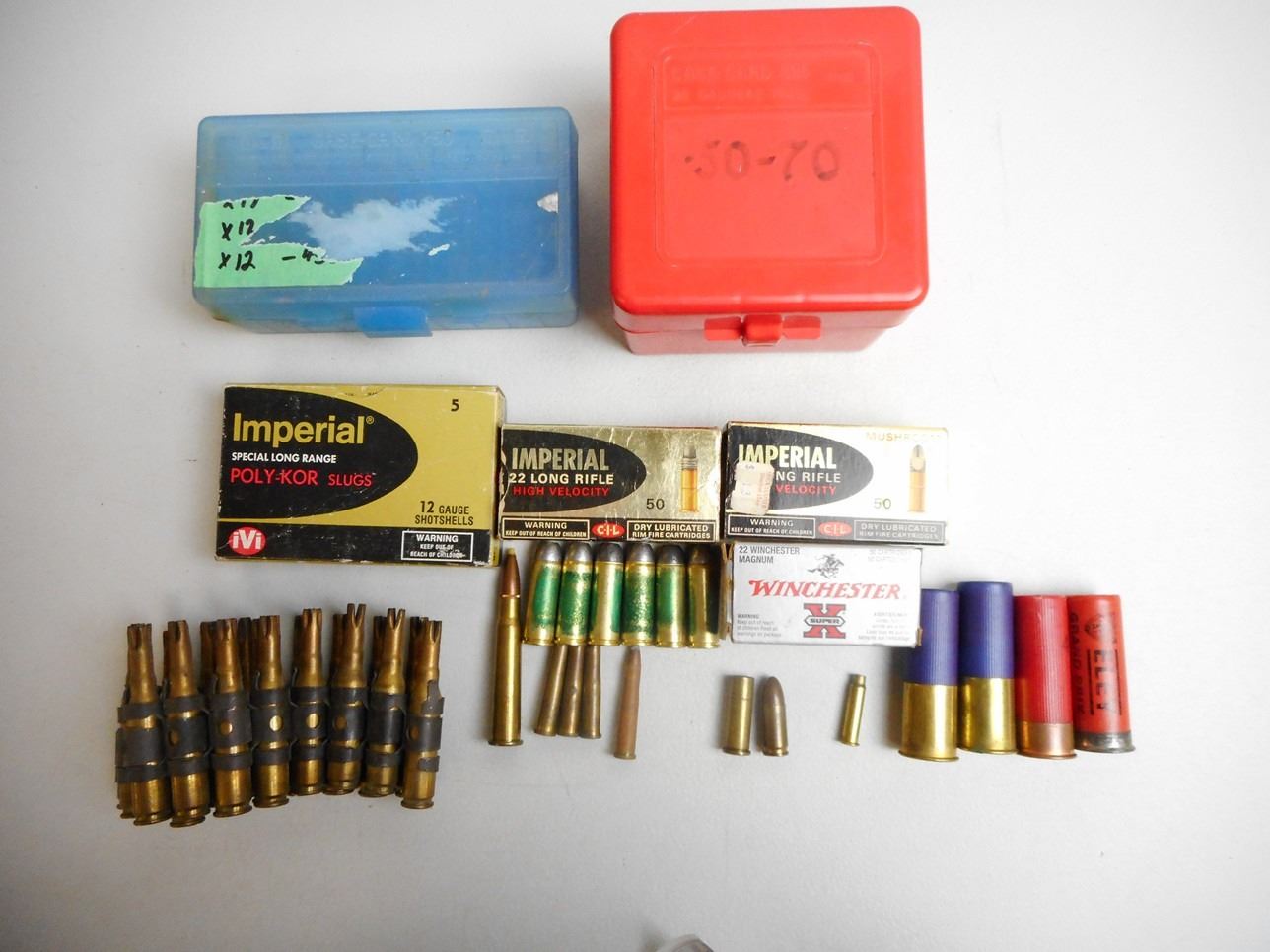 APPROX. 103 RNDS INCLUDES 22 IMPERIAL 22 LR, WINCHESTER 22 WIN MAG, 12 GA SLUGS, ASSORTED EXPENDED AMMO/ CASINGS & 22 RNDS EXPENDED 7.62 X 51 BLANKS & (20 PLASTIC AMMO CASES