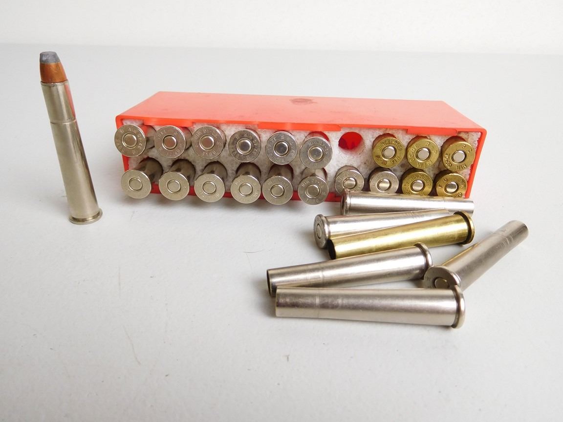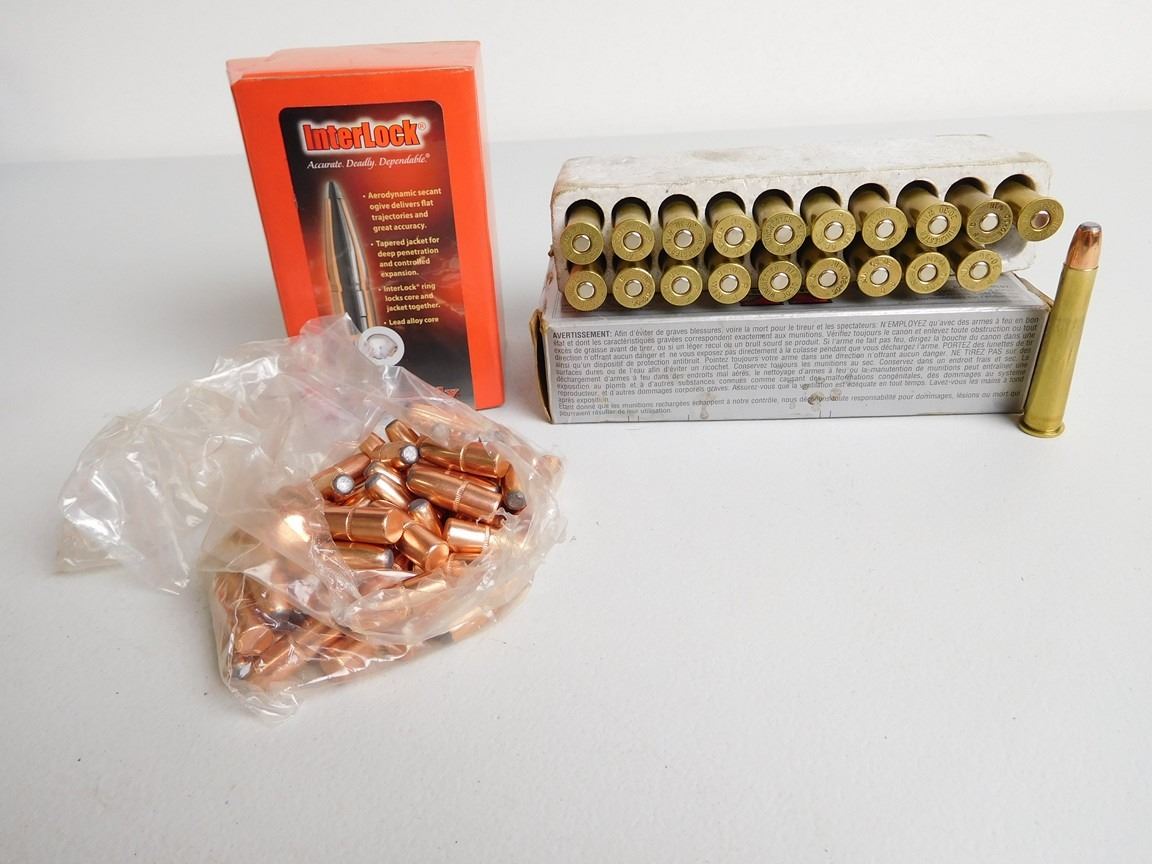 2 DIE SET IN ORGINAL CASE, APPROX 50 BULLETS AND 33 RNDS AND 13 PRIMED CASING