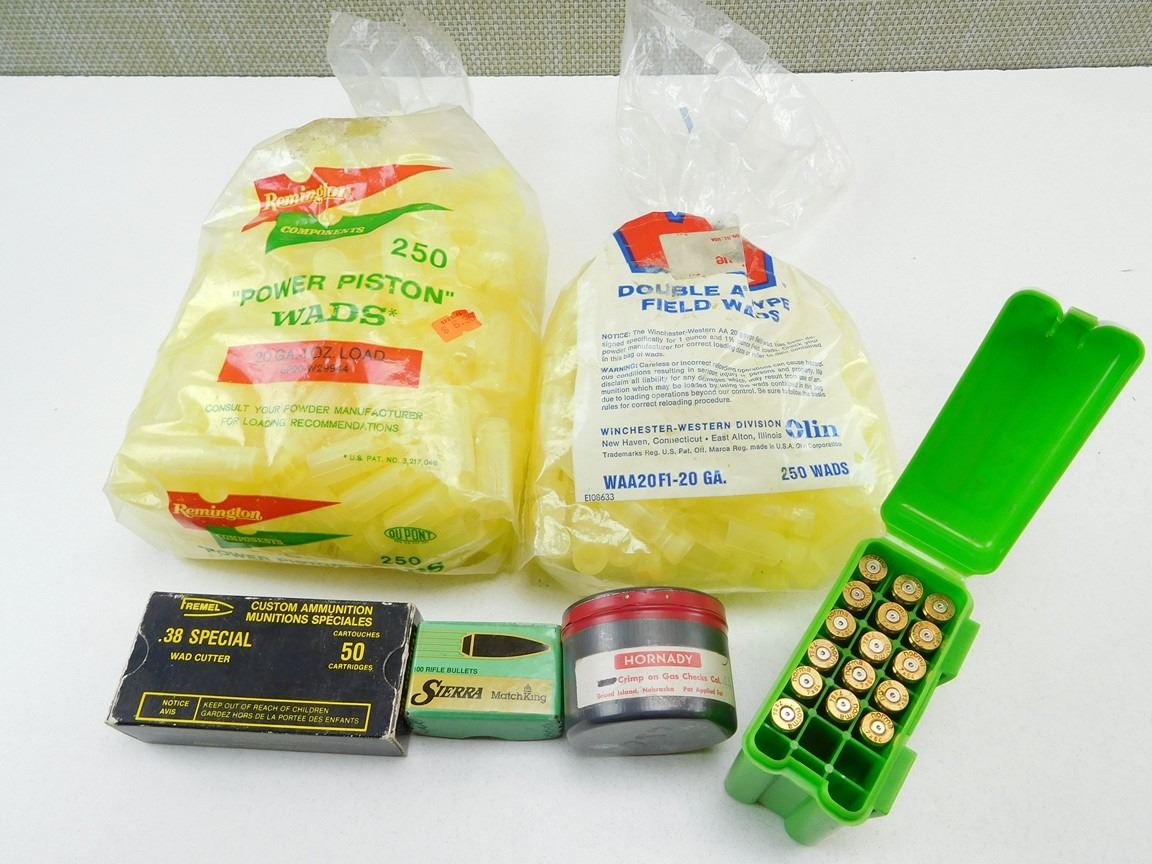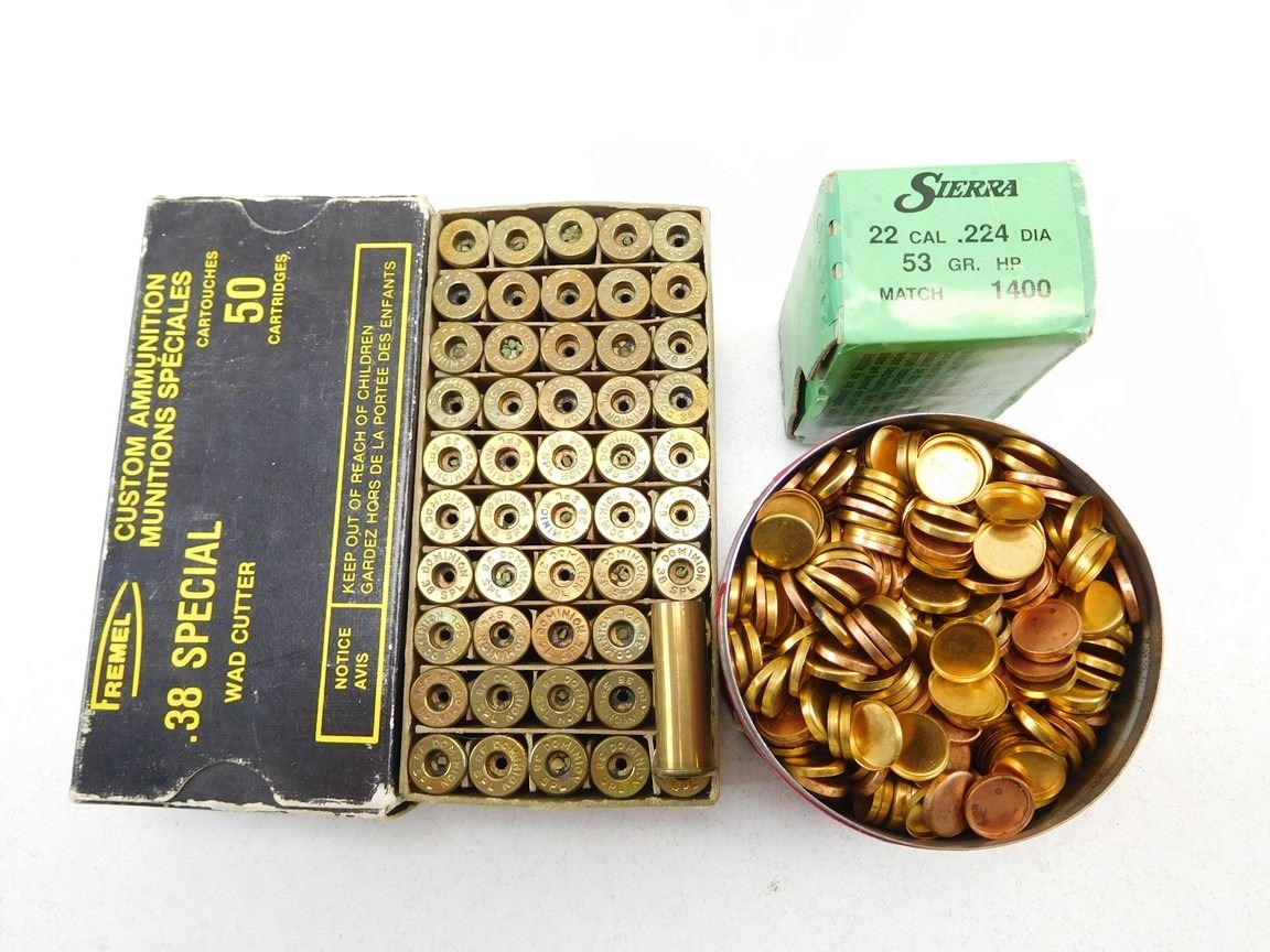 (16) CASES 7 X 64, IN CASE GARD20, HORNADY CRIMP ON GAS CHECKS CAL .44, (50) CASES .38 SPECIAL, (1) UNOPENED BOX OF SIERRA MATCH KING BULLETS 22 CAL .224 DIA, 53 GRAIN HP