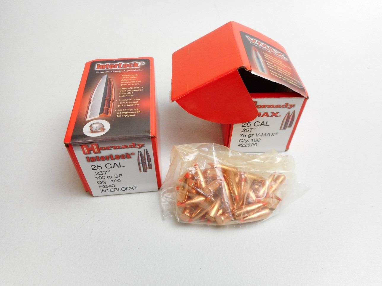 APPROX. 118 BULLETS 25 CAL (.257") INCLUDES 75 GRAIN V-MAX & 100 GRAIN SP
