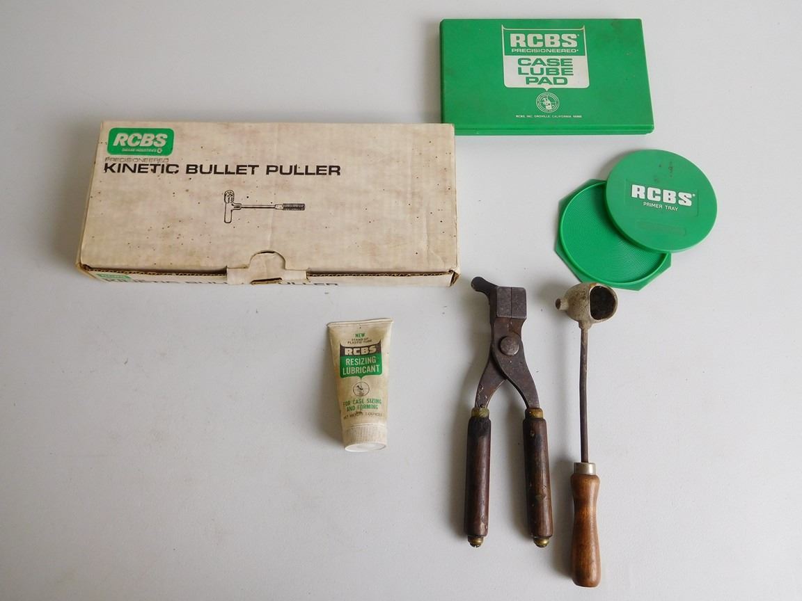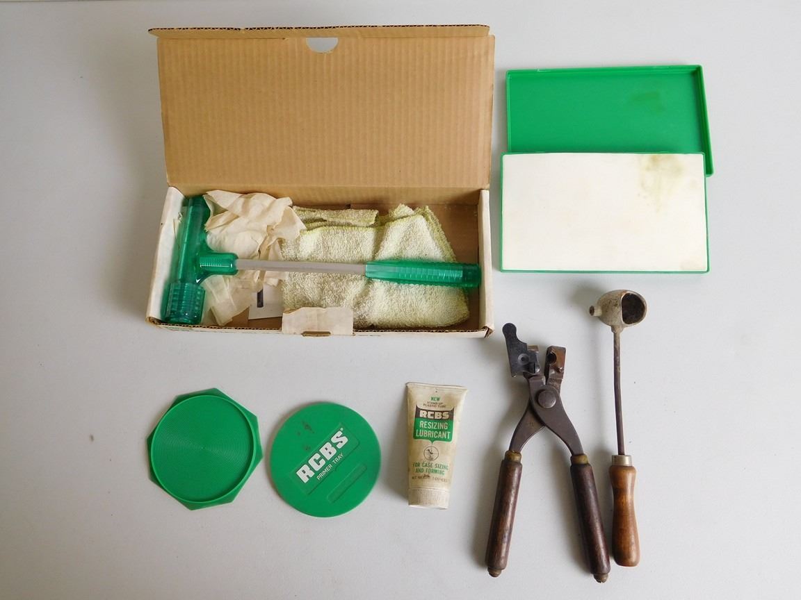 INCLUDES BULLET PULLER, LUBE PAD, BULLET MOULD HANDLES WITH MOULD, PRIMER TRAY, LEAD DIPPER AND LUBE