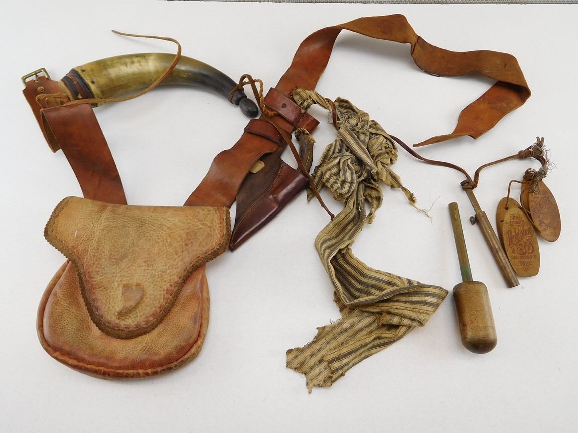 INCLUDES (1) LEATHER POUCH, MADE BY M.R. DOYLE, BOLTON ON., (1) FIXED BLADE KNIFE, POWEDER MEASURE, BULLET STARTER, POWDER HORN, AND (2) WOODEN FOBS FROM OFAH RENDEVOUS 79 & 80