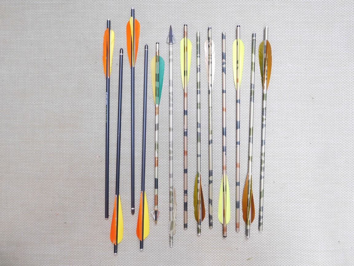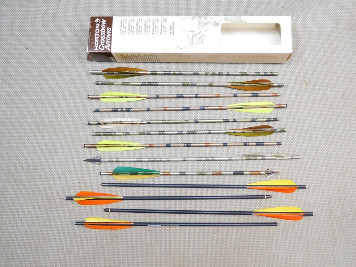 (13) ARROWS TOTAL: (7) CAMO ARROWS APPROX 20" LONG, (4) HORTON LIGHTING STRIKE 2 ARROWS 20" LONG: (3) HAVE TIPS, (2) CAMO ARROWS WITH BROAD HEADS: 16.5" & 20"