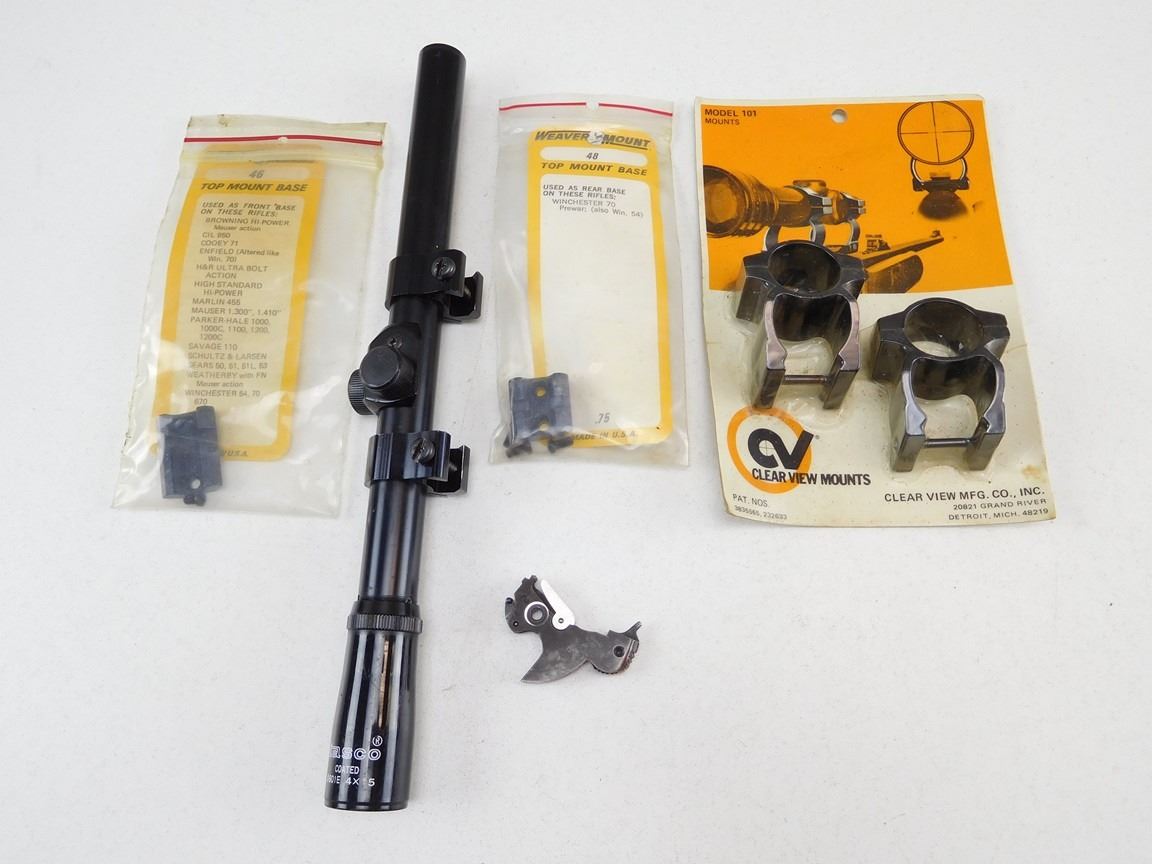 (1) TASCO SCOPE 4X5 WITH RINGS, PARTIALLY CLOUDED VISIBILTY, (1) CLEAR VIEW MO. 101 MOUNT & WEAVER MOUNTS # 46 & 48, (1) OLD COLT 38 SPECIAL MODIFIED HAMMER