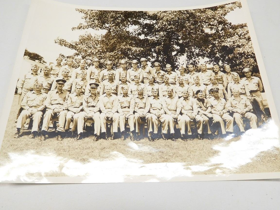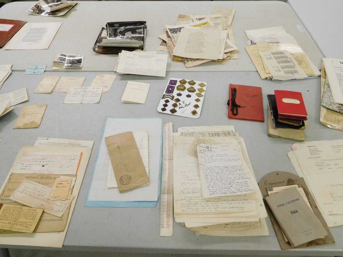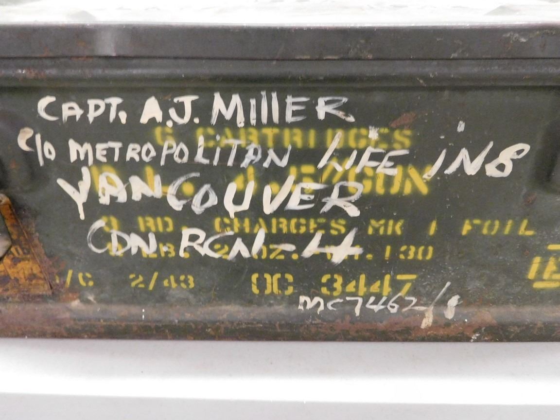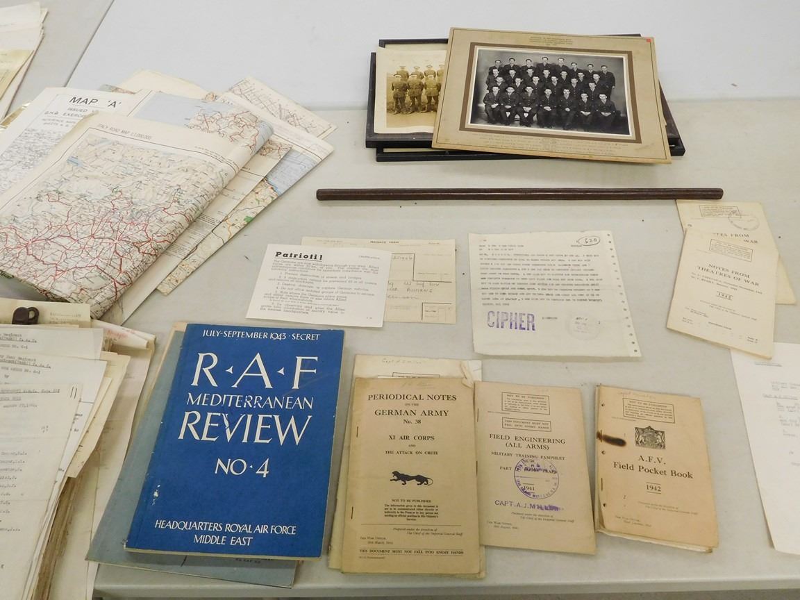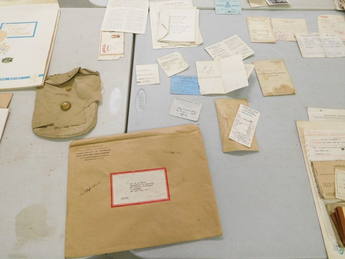 LARGE COLLECTION IN AMMO TIN 24 X 14.5 X 10" STAMPED 1942, INCLUDES MILITARY DOCUMENTS: INVOICES, MEDICAL RECORDS, BOOKLETS, CALEDER, MAPS, ASSORTED PHOTOS (2) FRAMED WITH GLASS 19 X 12" & 19 X 9", MANY UNFRAMED, LEATHER BATON, WEDDING BOOKLET, NEWSPAPER CLIPPINGS, PIPS, RIBBON, & BADGES, & PHOTOCOPIES OF DOCUMENTS