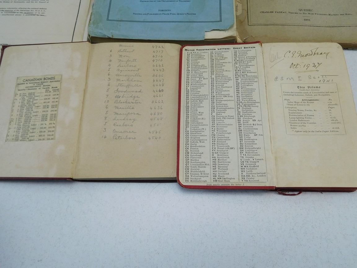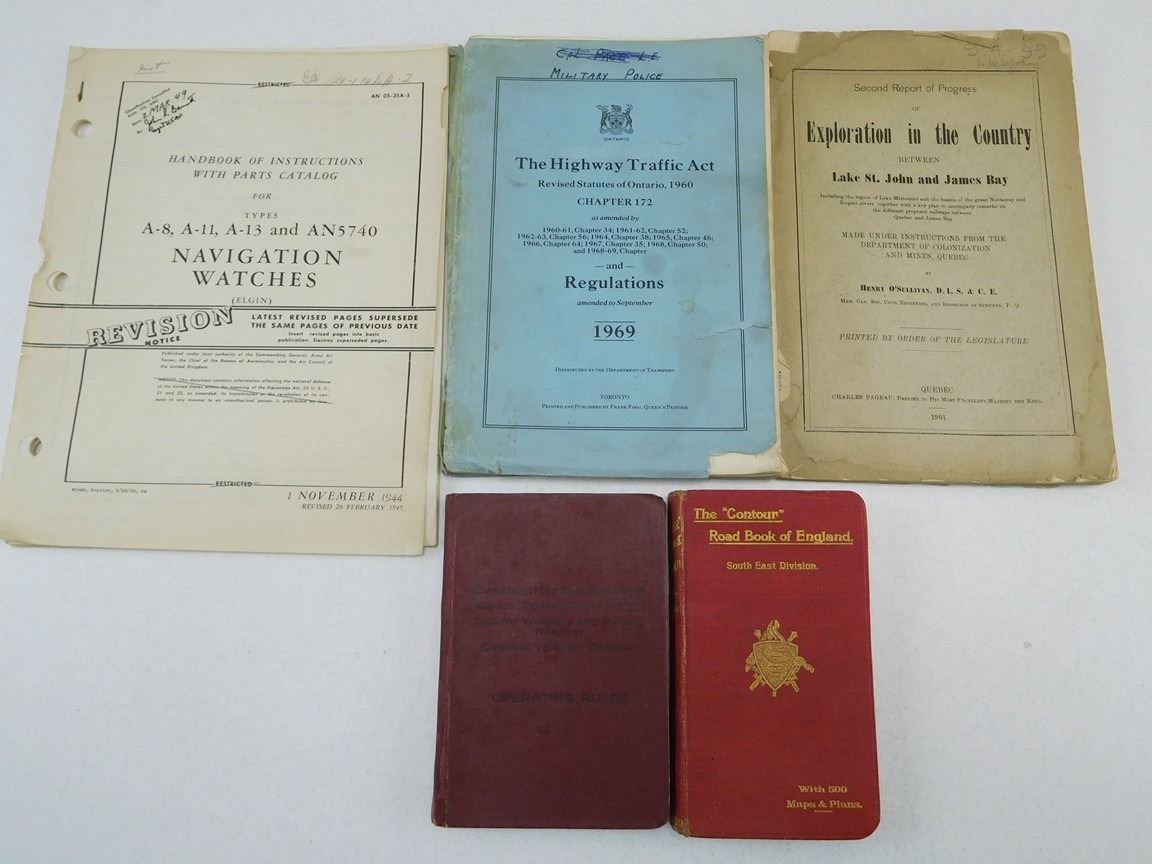 (1) BOOK ON THE HIGHWAY TRAFFIC ACT 1969, (1) CANADIAN NATIONAL RAILWAYS OPERATING RULES WITH INSERTED NEWSPAPER CLIPPINGS, (1) HANDBOOK OF INSTRUCTIONS WITH PARTS CATALOG FOR NAVIGATION WATCHES, (1) THE "CONTOUR" ROAD BOOK OF ENGLAND SIGNED AND DATED 1927, (1) SECOND REPORT OF PROGRESS EXPLORATION IN THE COUNTRY BETWEEN LAKE ST. JOHN & JAMES BAY