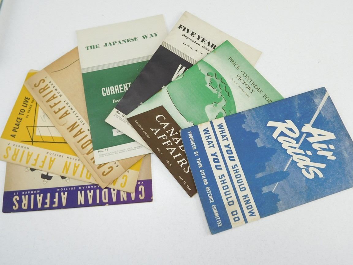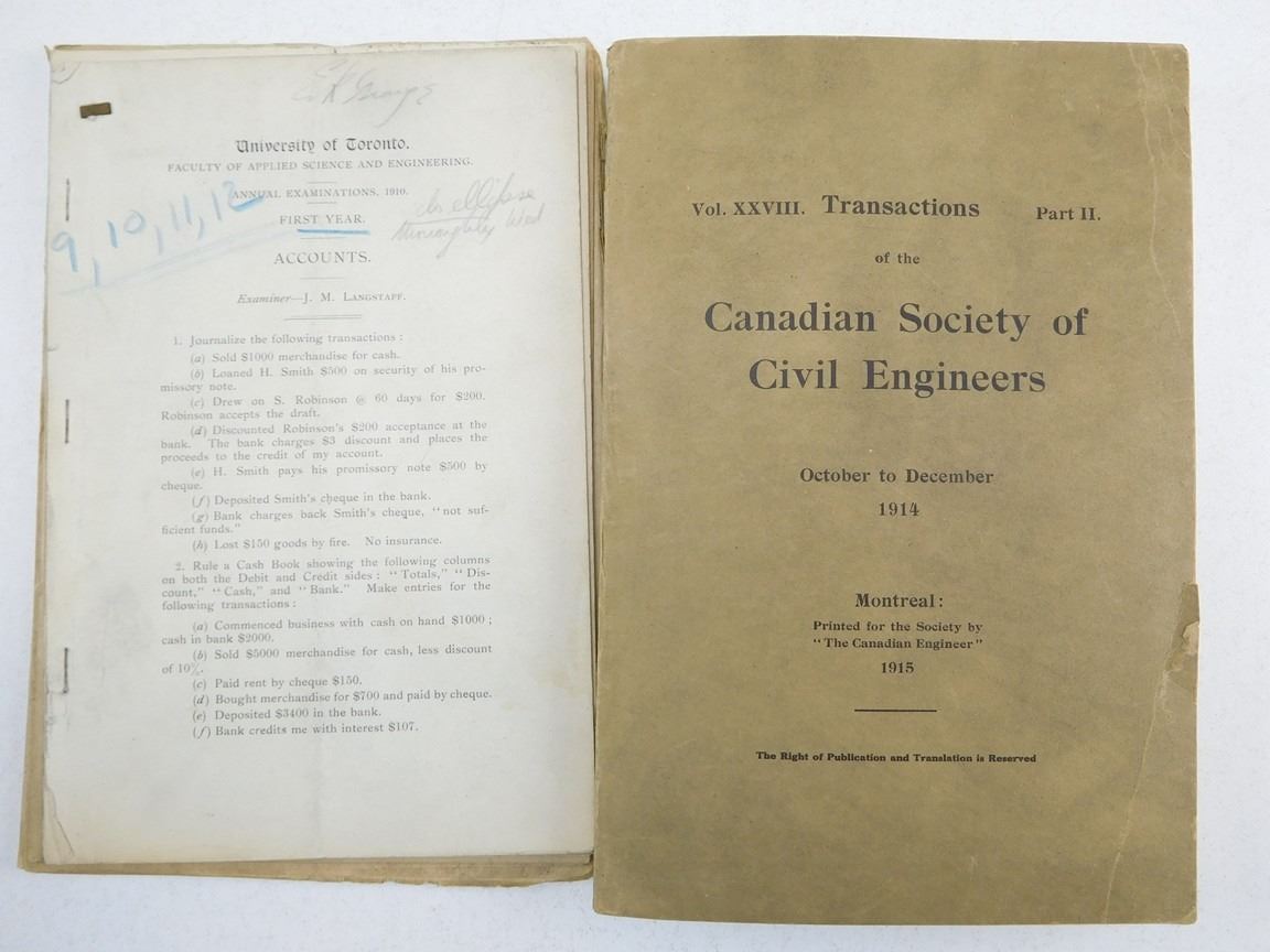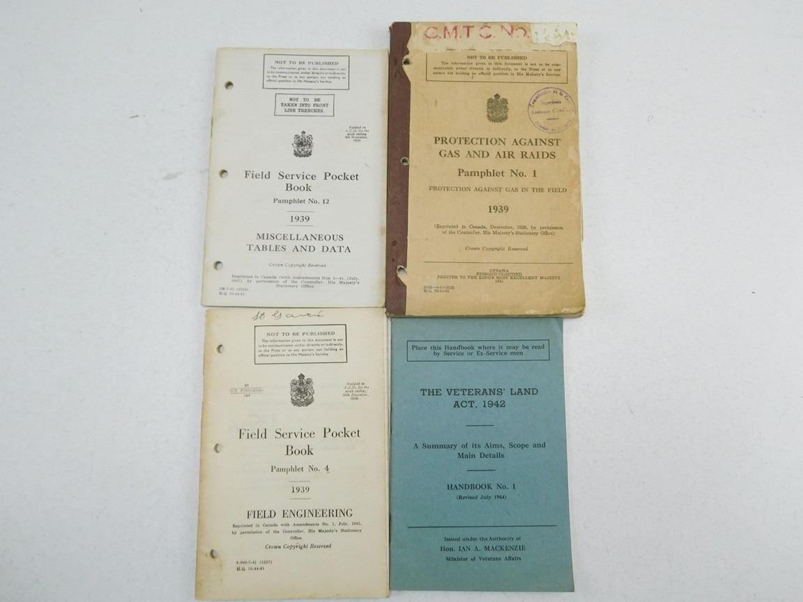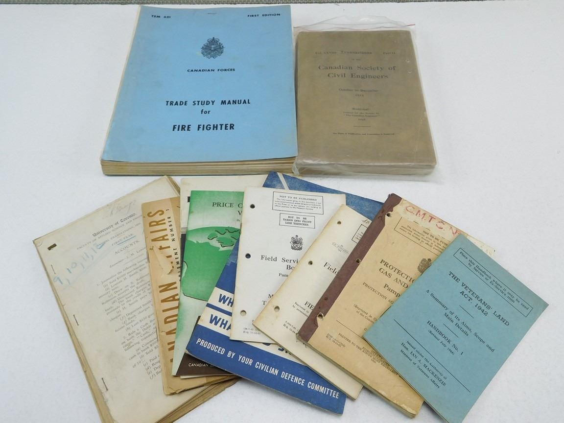 (1) CANADIAN SOCIETY OF CIVIL ENGINEERS, OCT-DEC 1914, (1) UNIVERSITY OF TORONTO FACULTY OF SCIENCE AND ENGINEERING ANNUAL EXAMINTIONS, 1910, FIRST YEAR, (1) CANADIAN FORCES TRADE STUDY MANUAL FOR FIRE FIGHTER DATED MAR 68, (2) FIELD SERVICE POCKET BOOK 1939, NO. 4 & 12, (1) PROTECTION AGAINST GAS & AIR RAIDS 1939 NO. 1, (1) THE VETERANS' LAND ACT 1942 (REVISED 1944), ASSORTED AIR RAIDS & CANADIAN AFFAIRS PAMPHELTS