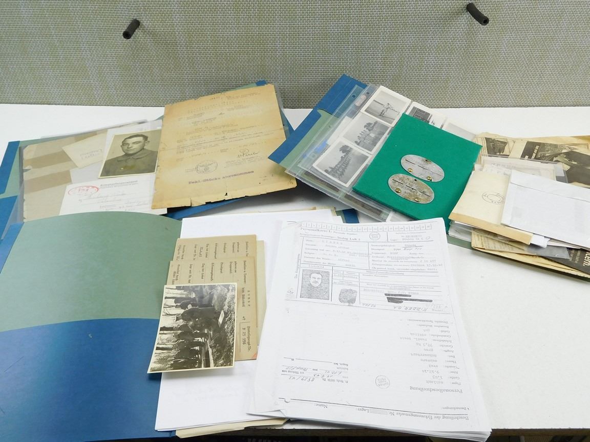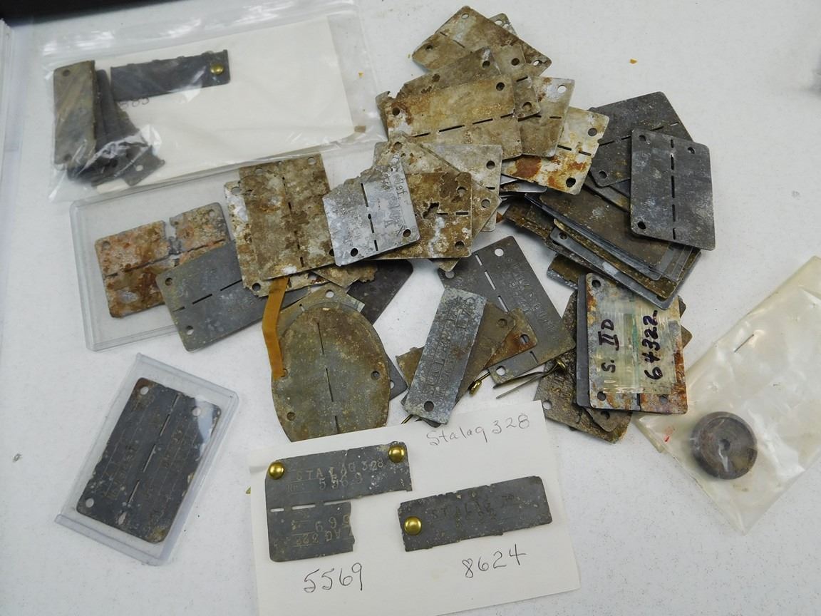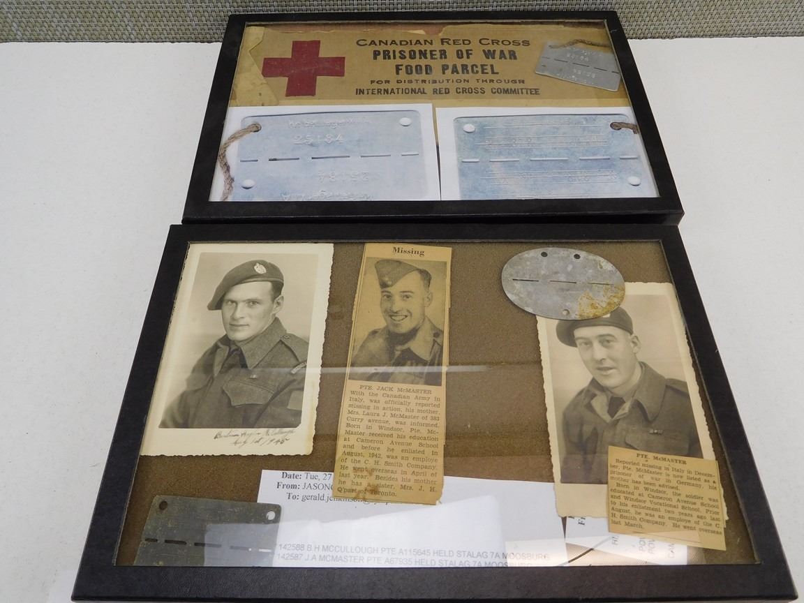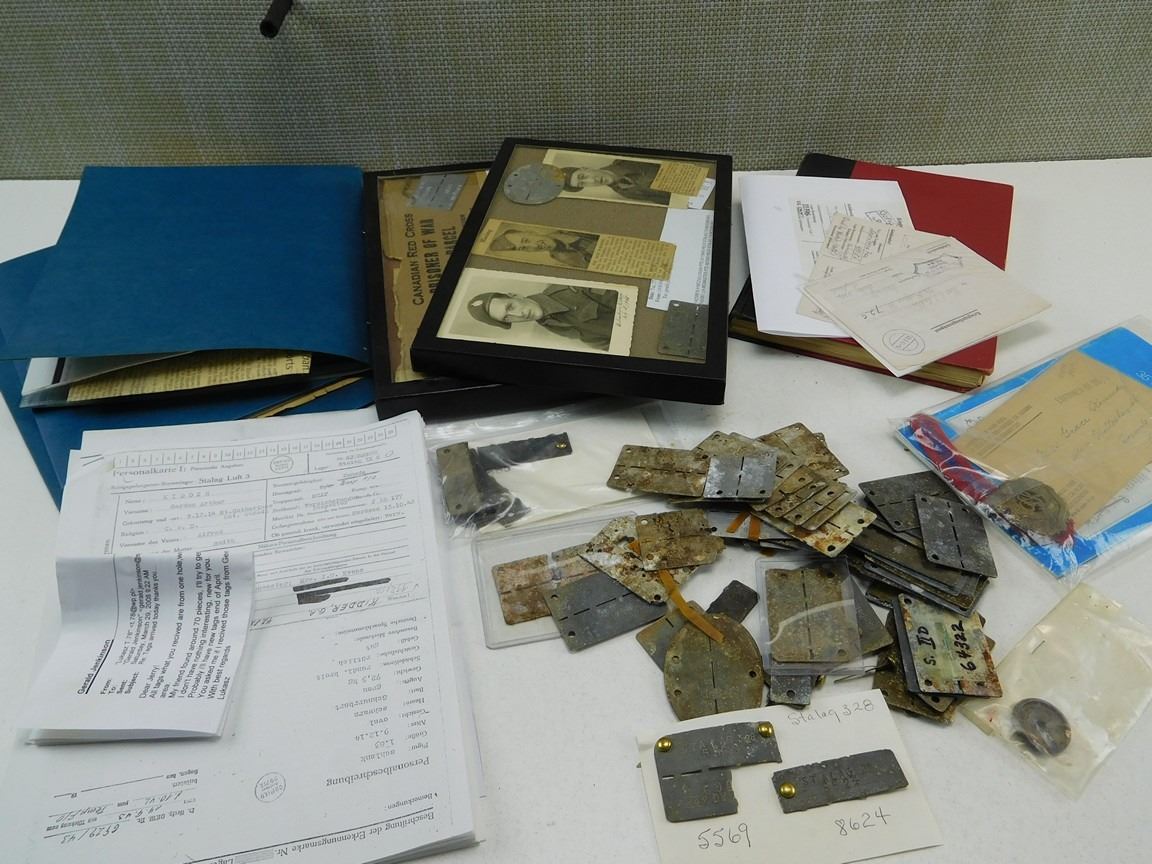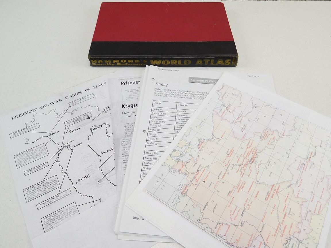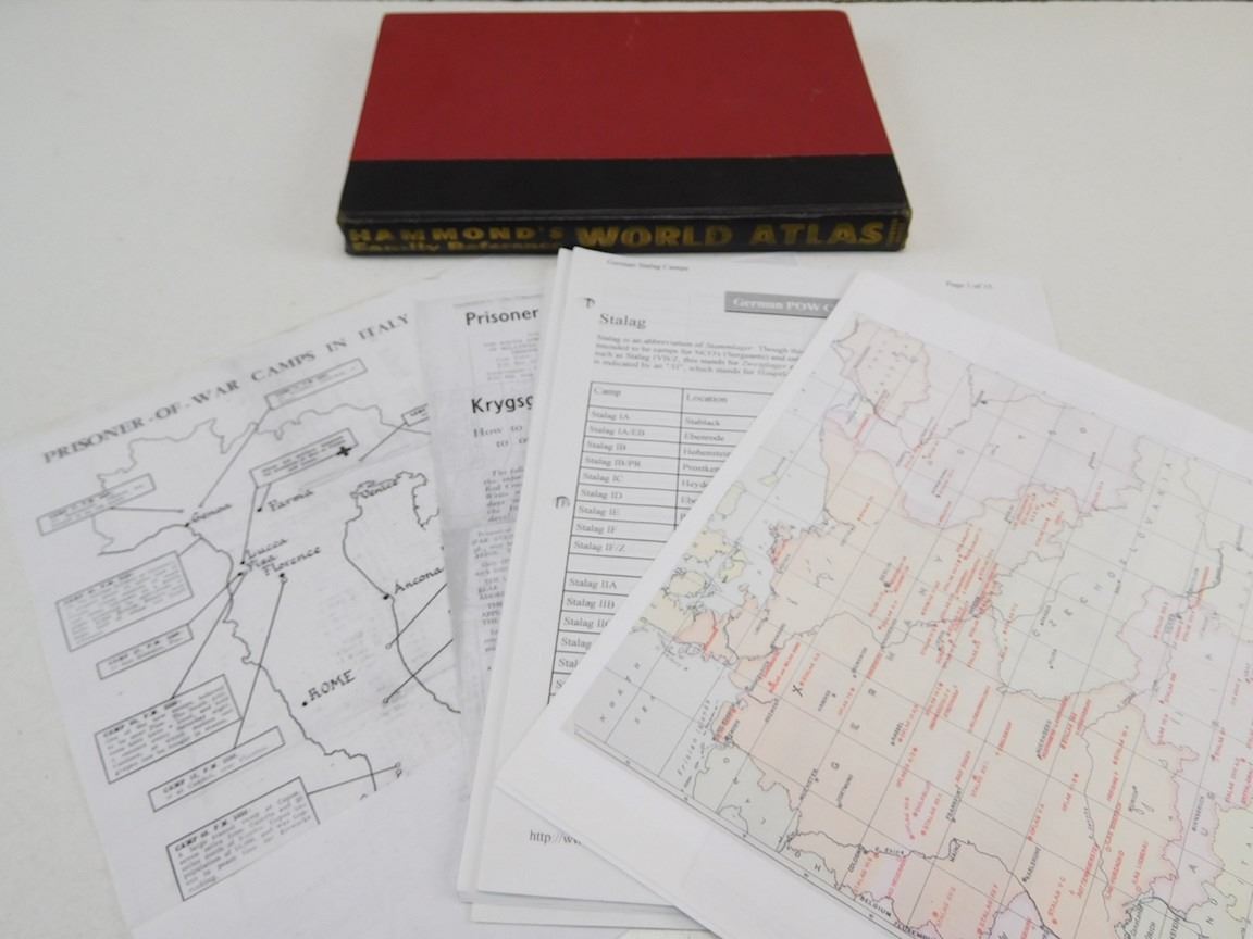INCLUDES LISTS AND MAP OF LOCATIONS AND LIMITED OPENING & CLOSING DATA, ALSO NAMES OF CANADIAN P.O.W.S & RECOVERED STALAG TAGS, (1) HAMMOND'S WORLD ATLAS, RECORD OF INDIVIDUALS PARTICULARLY J.D. SOUTHWELL WHO SURVIVED THE 600 MILE MARCH FROM STALAG 344 INCLUDES POSTCARDS AND LETTERS AND OFFICIAL LETTER DECLARING HIM NOT "MISSING", AND TRANSFERINGS FROM STALAGS