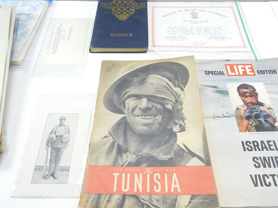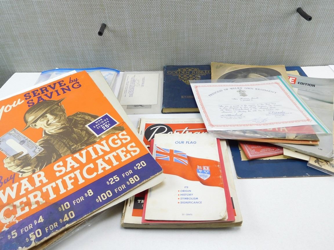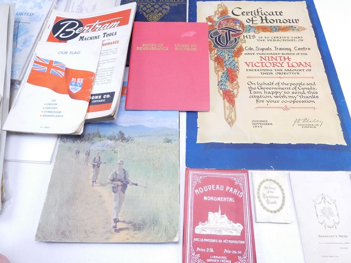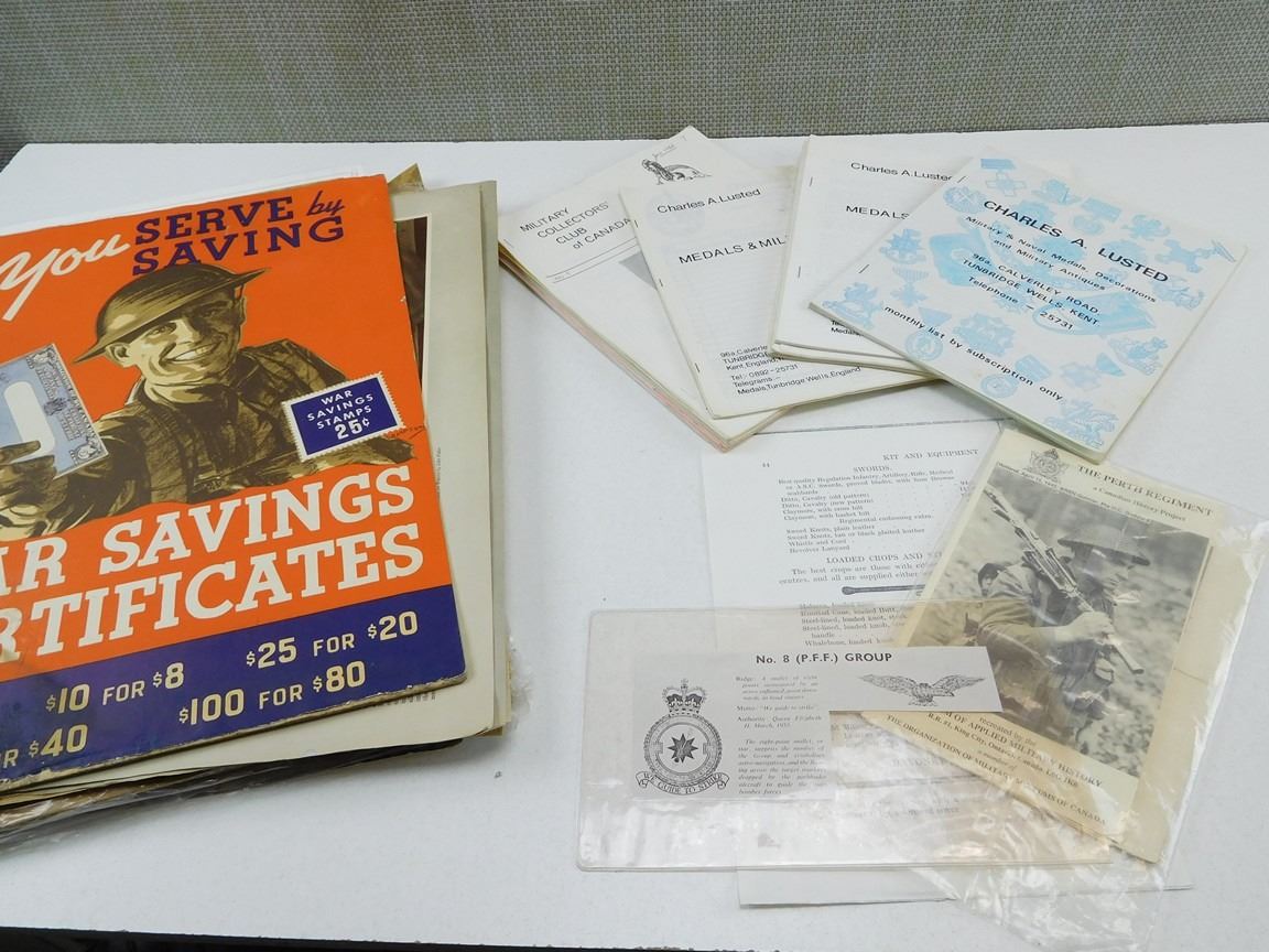 (1) THE GOLDEN JUBILEE 1869-1919, ASSORTED MONTHLY EDITIONS OF CHARLES A. LUSTED & MILITARY COLLECTOR'S CLUB OF CANADA, SOLDIER MAGAZINES, JUNE 1943 EDITION OF CANADIAN MACHINERY, (1) BOOKLET: MEDALS YEARBOOK 1983, (1) BOOKLET: BOOKS OF REMEMBRANCE, (1) BOOKLET: OUR FLAG, (1) CERTIFICATE OF HONOUR FOR CDN SIGNALS TRAINING CENTER 18 X 12" CARDBOARD