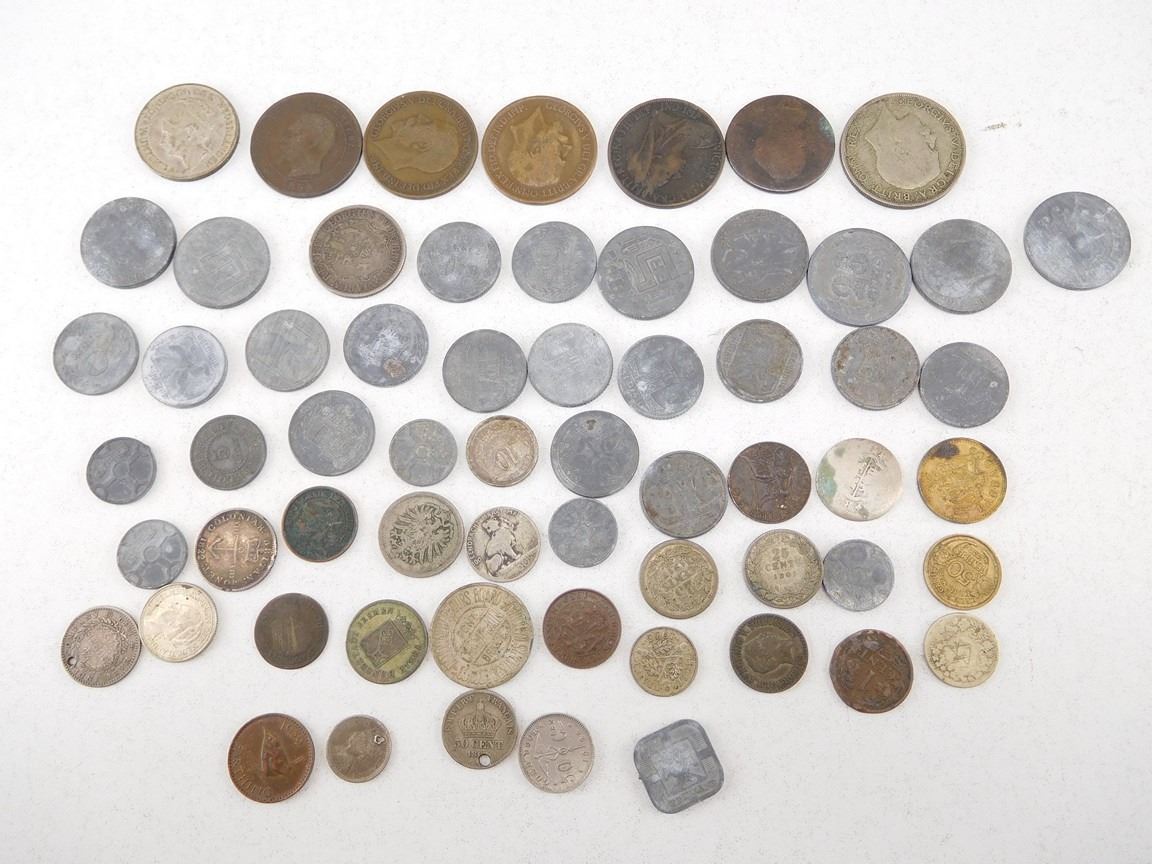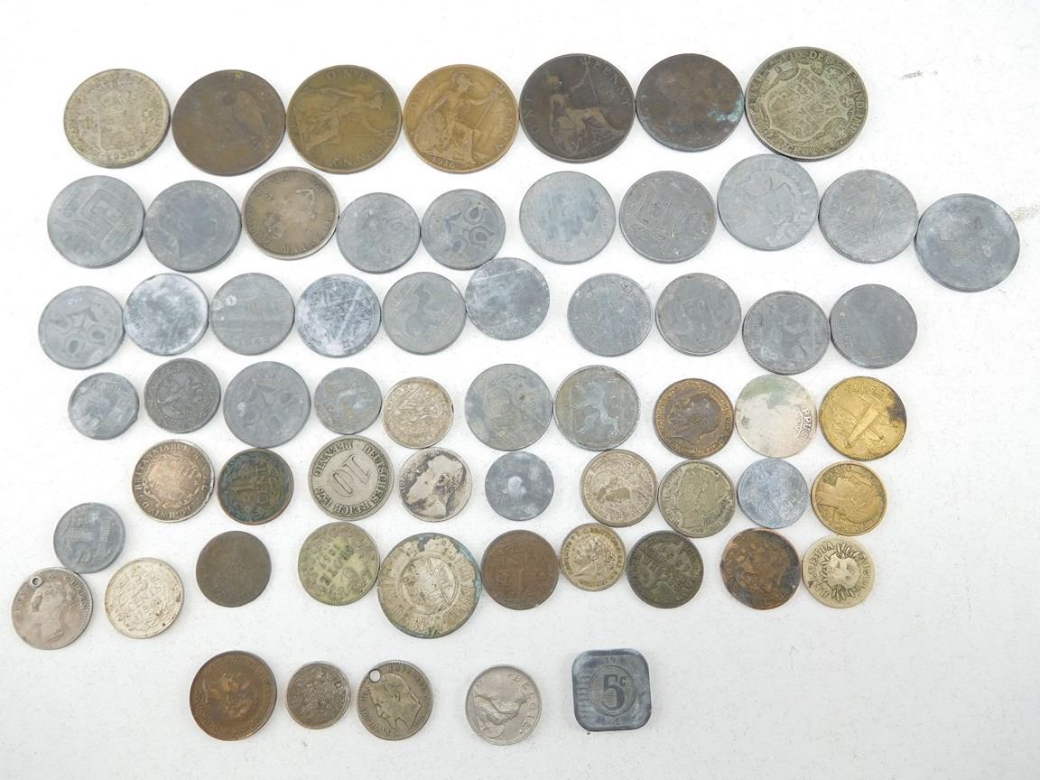INCLUDES 1855 EMPIRE FRANCAIS DIX CENTIMES, 5 CENTS BARBADOS, 1822 COLONAIR BRITAN MONET, 1875 10 PFENNIG, AND MORE