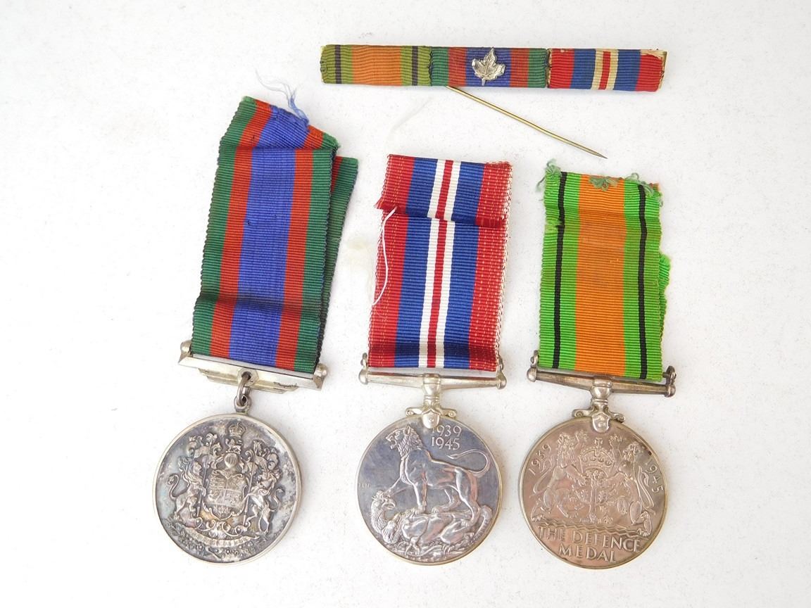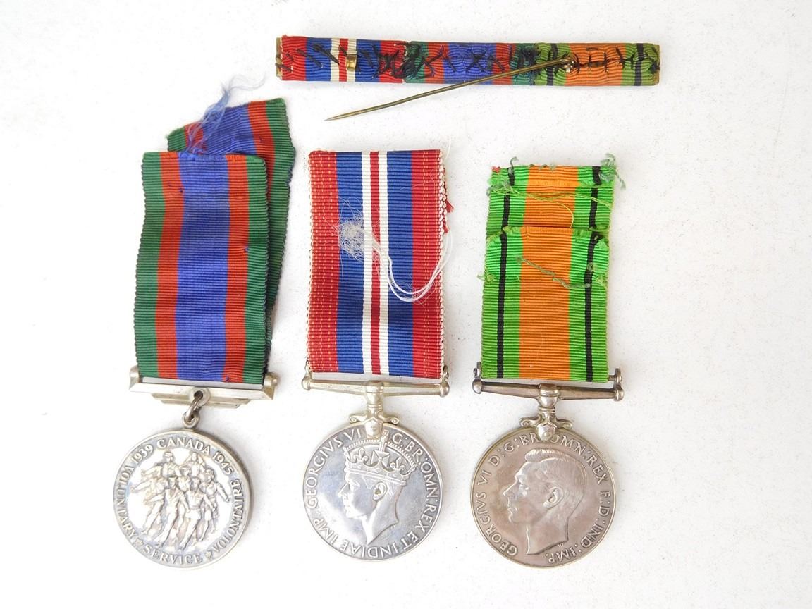 DEFENCE MEDAL, CANADIAN VOLUNTARY SERVICE MEDAL, WAR MEDAL, WITH RIBBONS, AND RIBBON BAR